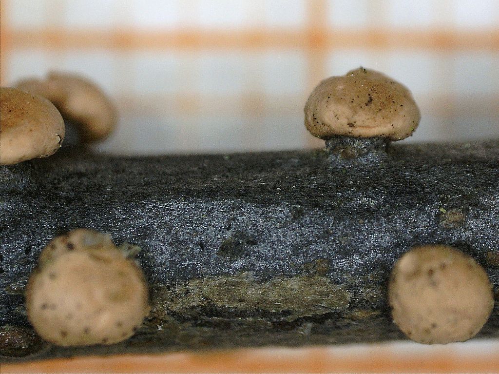 Fruchtkörper: Kleine (ca. 1-1.5 mm Durchmesser), matt-rosafarbene Knubbel auf rindenfarbenem Stiel