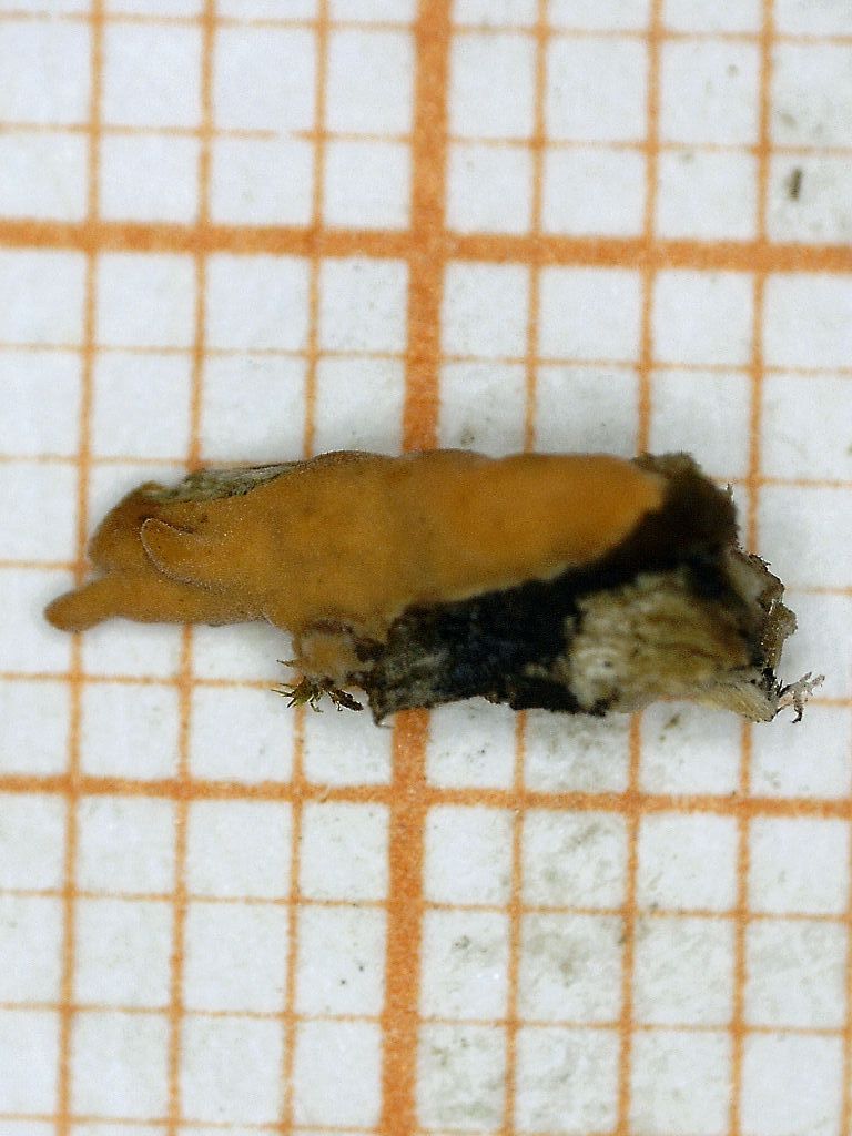 Fruchtkörper: Orange-rosa, kugelförmig reihig zusammenwachsend, teils keulig schräg aufgerichtet