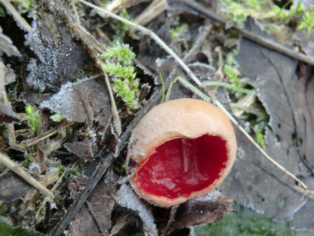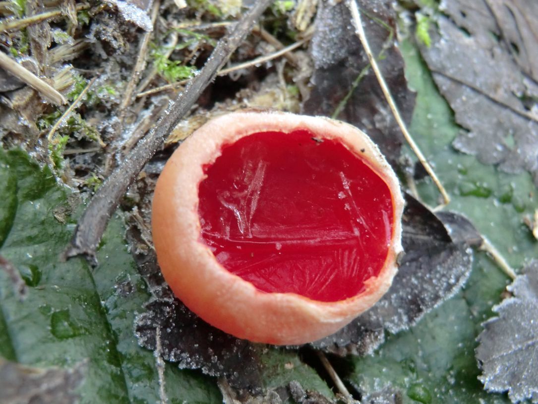 Sarcoscypha stimmt sicherlich, aber man muss mikroskopieren, um S. coccinea (den Scharlachroten Kelchbecherling) und den S. jurana (den Jura-Kelchbecherling) ausschließen zu können. Ich gratuliere zum Fund! :thumbup: