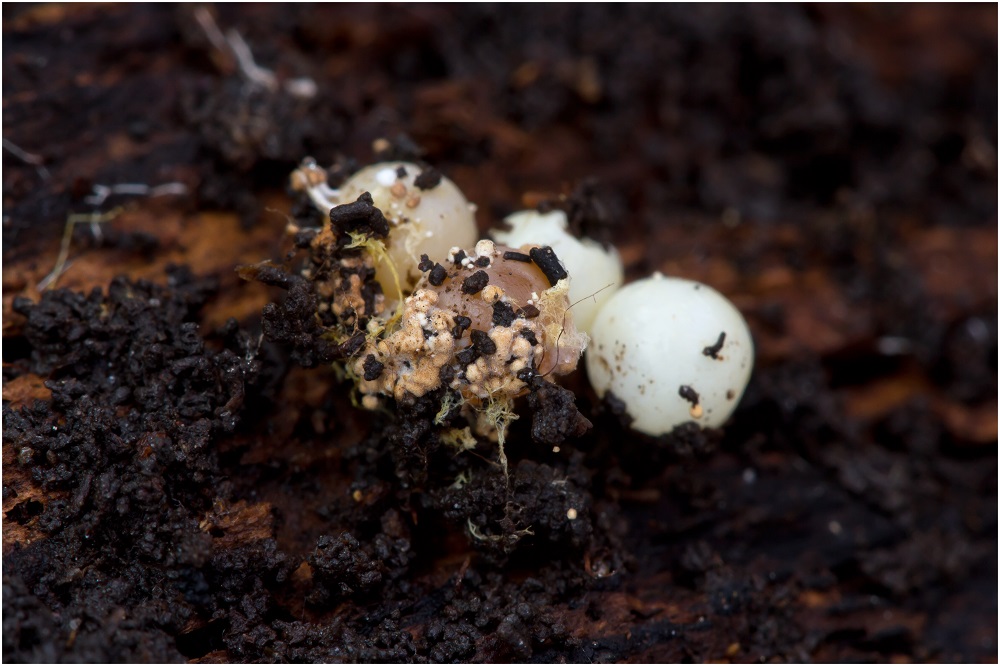 Die weißen Kügelchen solltest Du im Auge behalten. Entweder sind das auch Gymnoascus im Anfangsstadium, oder das wird sowas draus, wie in dem von Dir verlinkten Beitrag zu meinem Fund. Die fangen nämlich auch als weiße Flaumkügelchen an.