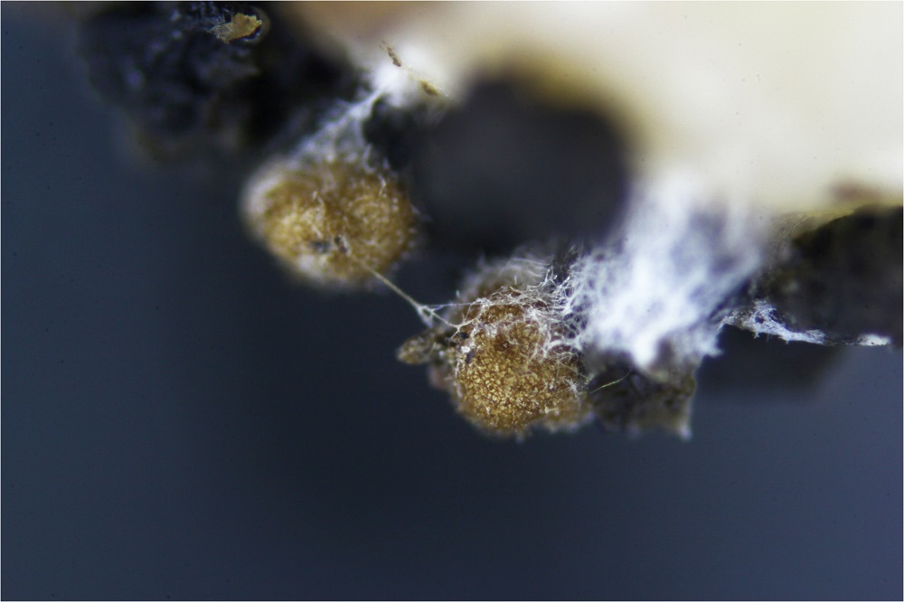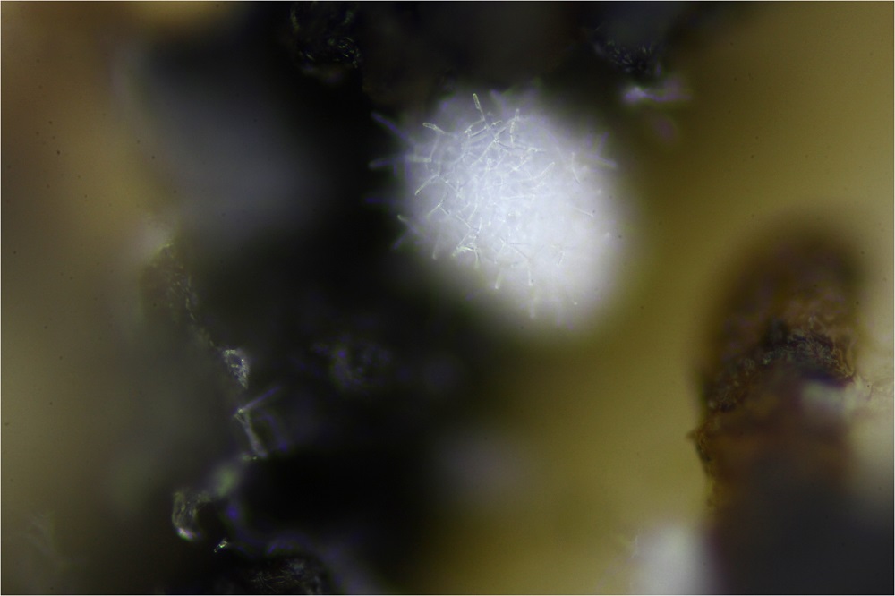 Die weißen Kügelchen könnten ebenfalls zu der Ordnung gehören. Ornamentierte Sporen kommen bei den Onygenales recht oft vor.