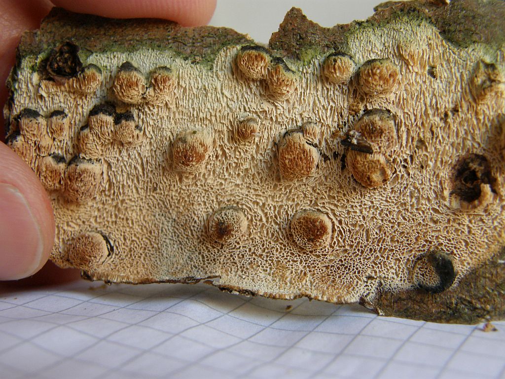 Das labyrinthische Aussehen der weichen, leicht abzureißenden Poren erinnerte mich an Schizopora paradoxa, aber auffallend fand ich die zahlreichen rundlichen, oben schwarzen Knubbel - siehe Fotos. Bei näherem Hinsehen denke ich, daß es sich um irgendeinen Pyreno oder kohlenbeerenartigen Pilz handelt, der sich seinen Weg durch den labyrinthischen Bezug an die Oberfläche sucht - aber innen sind die Knubbel nur schwarz und nix weiter zu finden. Der labyrinthische Überzug läuft zum Rand hin flach aus und läßt sich relativ leicht abziehen.