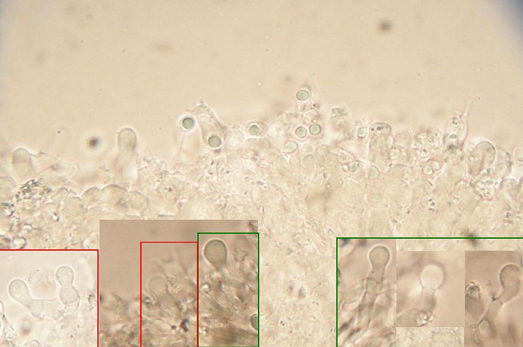 Was mir nicht gefallen hat, war zum Einen, daß ich zunächst mal keine kopfigen Hyphenenden finden konnte. Und die sind erstens ein Gattungsmerkmal, zweitens bei S. radula häufiger anzutreffen als bei S. paradoxa, sollten eigentlich schon zu sehen sein. Was ich gefunden habe sind spindelige Zystidiolen (hier nicht von Bedeutung) und Basidiolen, die bisweilen so getan haben, als wären sie kopfige Elemente (siehe rot eingerahmte Elemente im folgenden Bild).