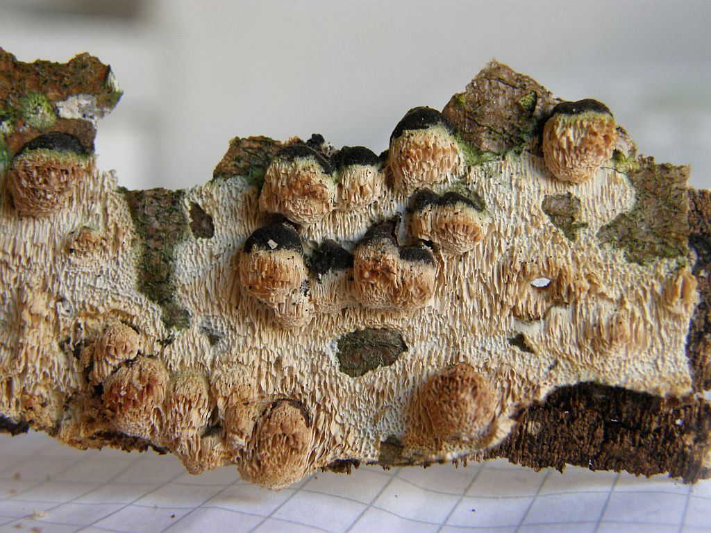 Das labyrinthische Aussehen der weichen, leicht abzureißenden Poren erinnerte mich an Schizopora paradoxa, aber auffallend fand ich die zahlreichen rundlichen, oben schwarzen Knubbel - siehe Fotos. Bei näherem Hinsehen denke ich, daß es sich um irgendeinen Pyreno oder kohlenbeerenartigen Pilz handelt, der sich seinen Weg durch den labyrinthischen Bezug an die Oberfläche sucht - aber innen sind die Knubbel nur schwarz und nix weiter zu finden. Der labyrinthische Überzug läuft zum Rand hin flach aus und läßt sich relativ leicht abziehen.