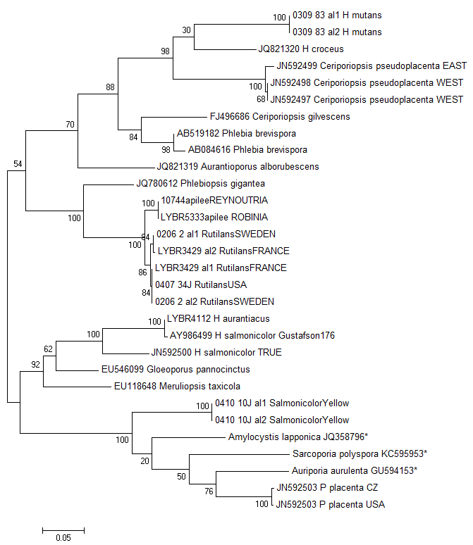 Ceriiporiopsis herbicola ist mikroskopisch Hapalopilus nidulans (rutilans) sehr ähnlich, was auch die Verwandtschaft bei der Sequenzierung verrät. Ich hänge mal ein Bäumchen von Josef Vlasak zu diesem Fund (10744apileeReynoutria) hier an.