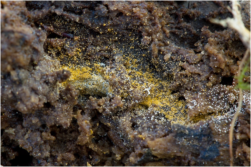 Vor 3 Tagen (10.03.16) fand ich an einem vermoderten Holzblock, winzig kleine weißen und gelbe Pünktchen.