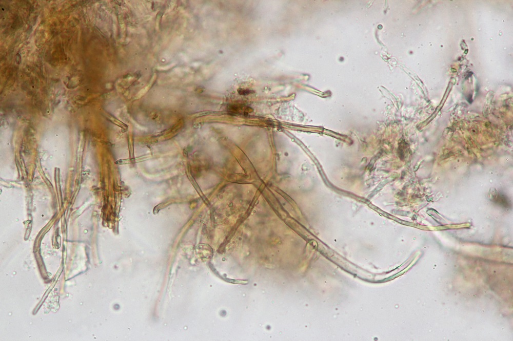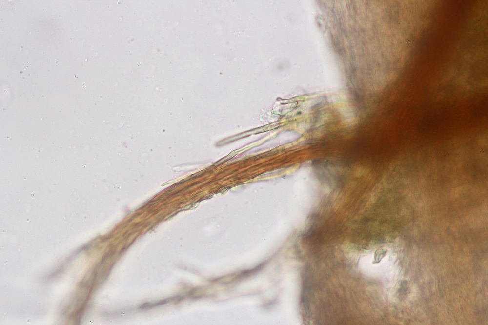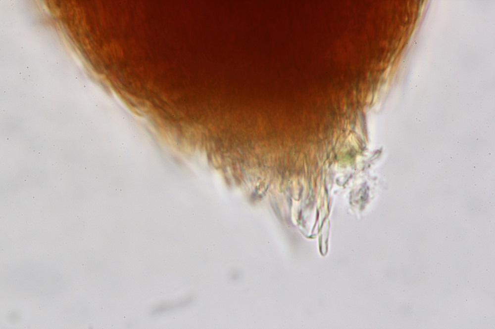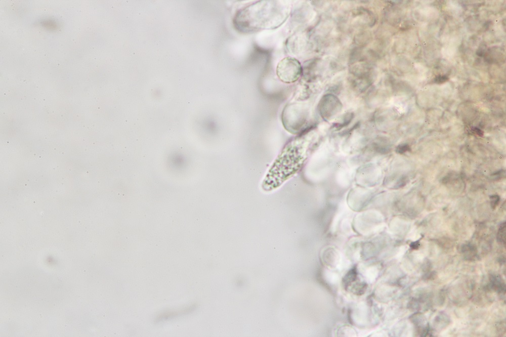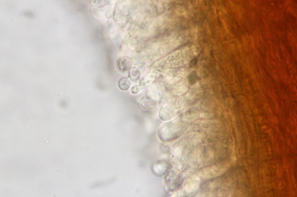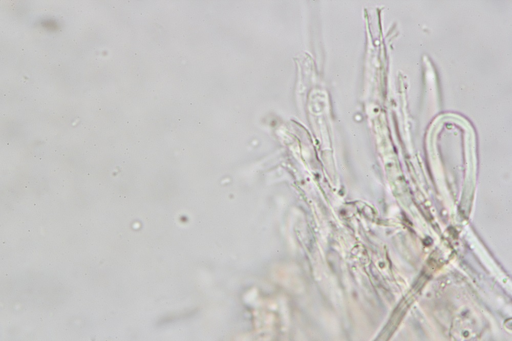 Cheilos gibt es da nicht, weil der hat ja keine Lamellenschneiden. Und die Gloeozystiden sitzen nicht an den Stachelspitzen (da sind nur die Hyphenenden, die du auch aufgenommen hast). Das Hymenium ist nur an den Flanken der Stacheln, und da sind auch die Gloeozystiden. Gloeo-, weil angefüllt mit lauter Öltröpfchen.