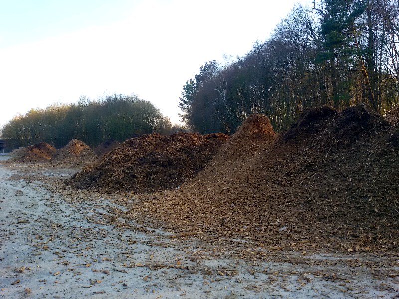 Ich bin bei einem Spaziergang gestern auf etwas sehr Interessantes gestoßen. Auf einem Lagerplatz sah ich bis zu drei Meter hoch geschüttete Holzhäcksel, die offenbar etwas ausbrüten. Sie dampften oben recht heftig. Dort kondensierte auch teilweise der Dampf, weshalb sie eine dunklere Kuppe hatten. Das hat mich doch interessiert. Dachte mir schon, dass die Wärmeenergie von Pilzen erzeugt wird. Ich wühlte dann nur etwa 10cm tief (wollte ja nichts kaputt machen) in einen dieser Holzberge, die auch von der Seite etwas Wärme abstrahlten und stieß direkt auf weißes Pilzmyzel. Das Holz wird überwiegend Nadelholz gewesen sein. So roch es jedenfalls und es waren einige Fichtenzweige darin zu erkennen.