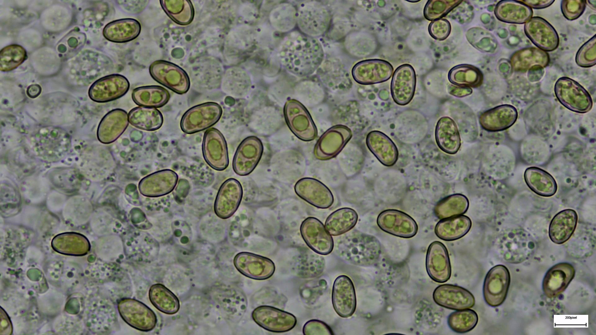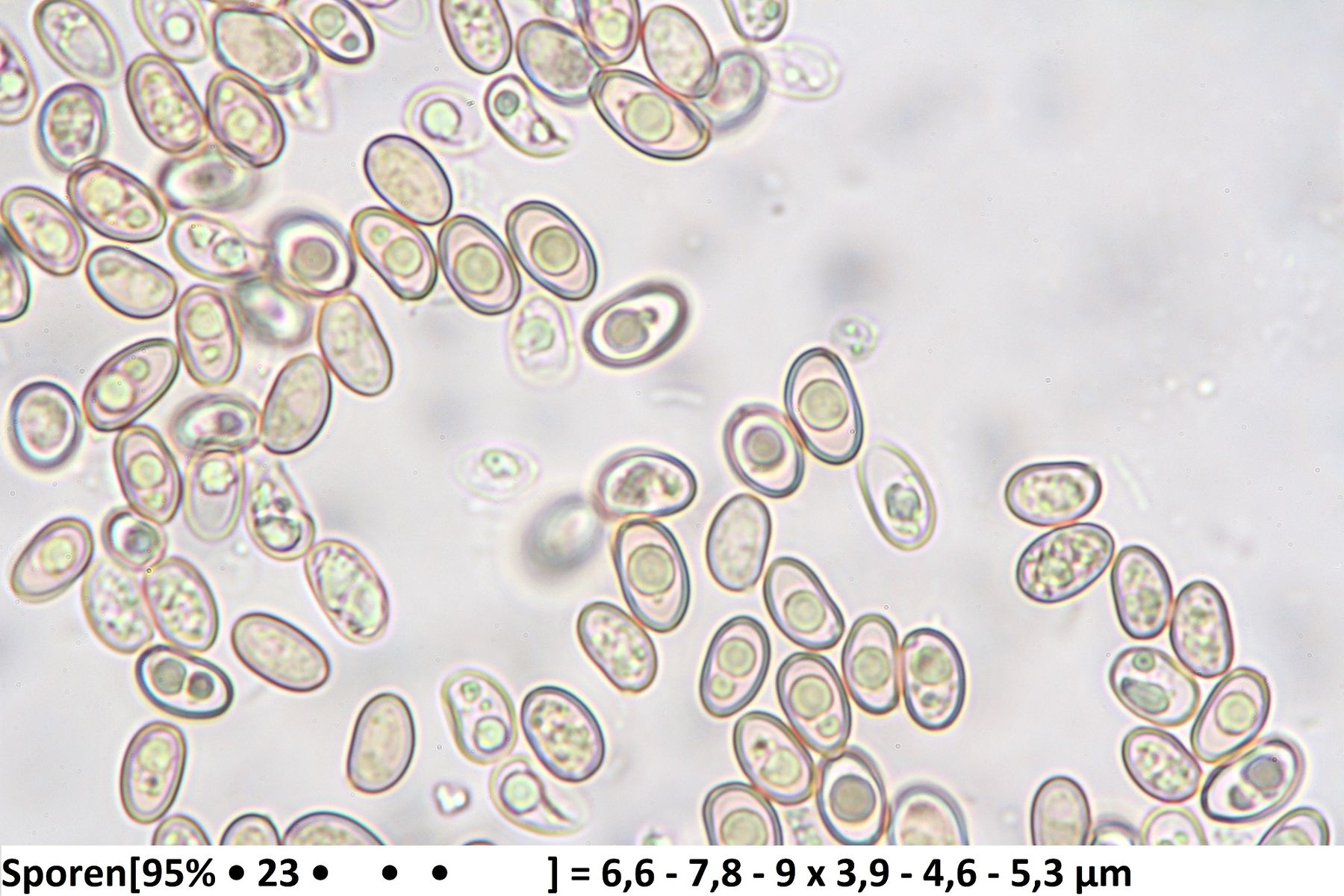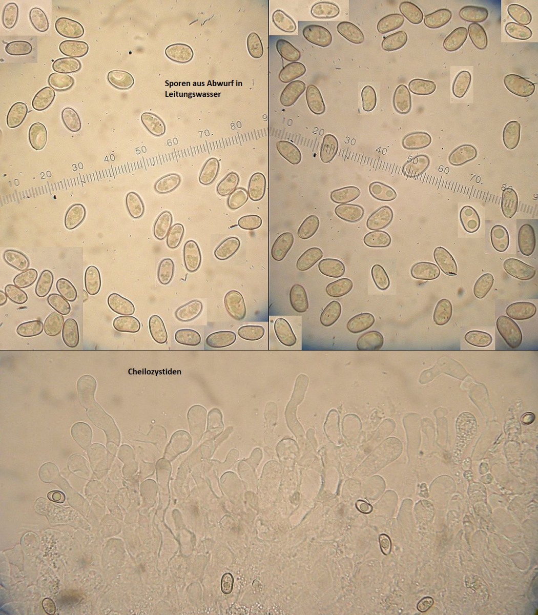 Sporen: im Abwurf braun bis gelbbraun, eher hell, ohne Violett- oder Purpurtöne; Sporen glatt, unregelmäßig ellipsoid bis angedeutet bohnenförmig; ohne (bzw. mit sehr undeutlichem bis unsichtbarem) Keimporus; ca. 6,5-10,5 x 4,5-7