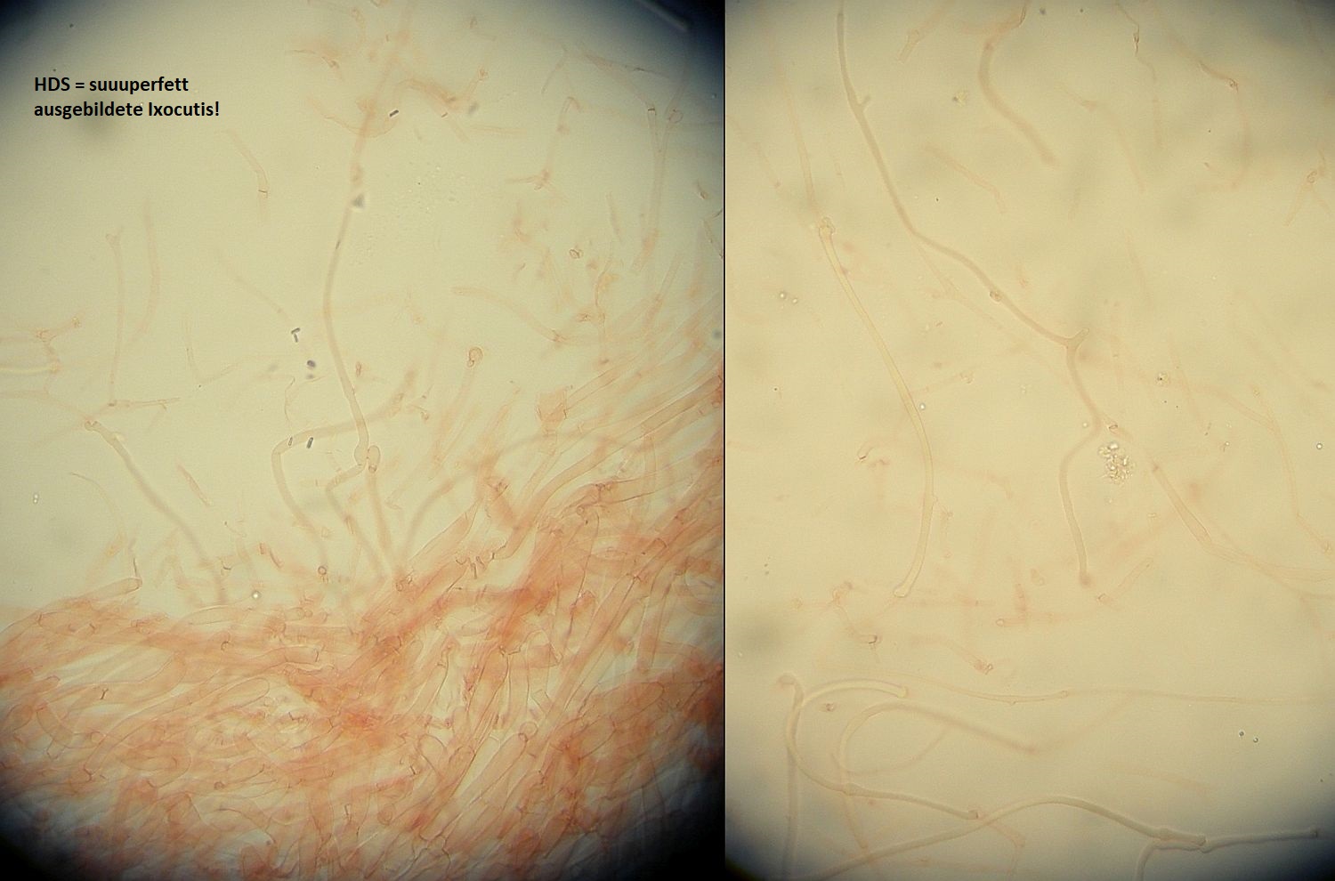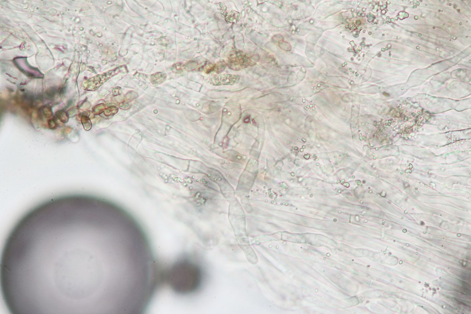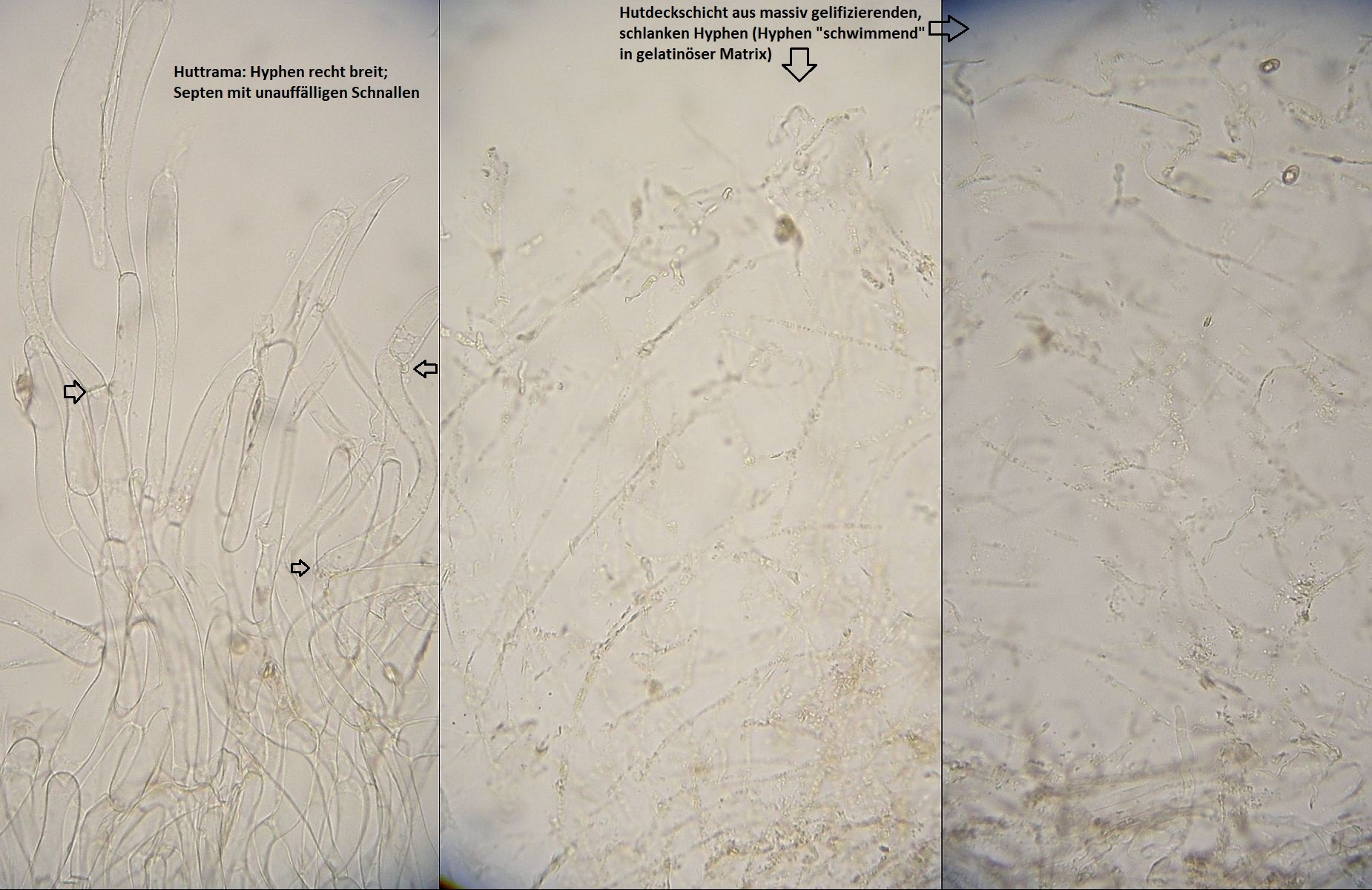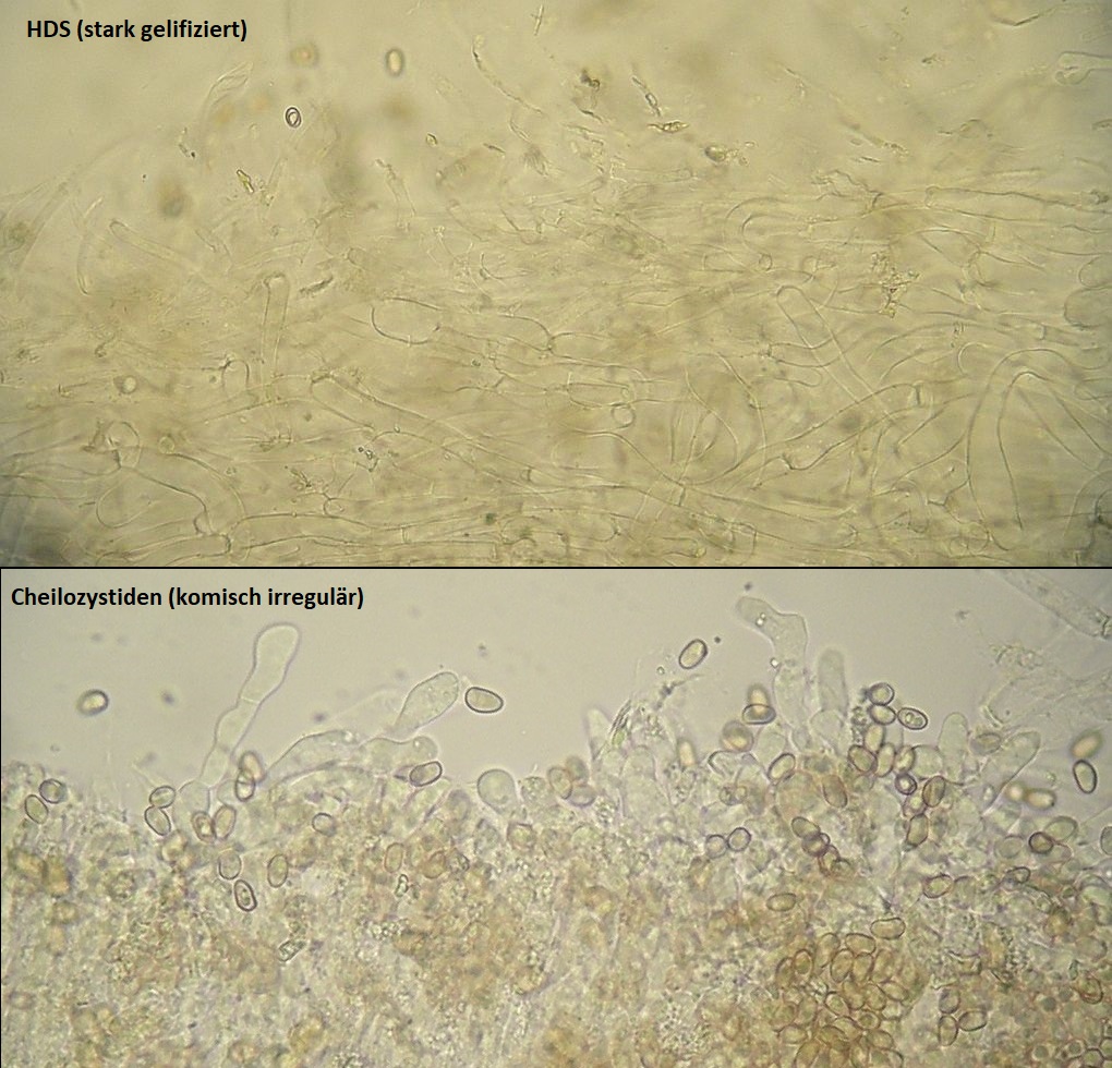 Huthaut ohne Pileozystiden, Cutis aus liegenden Hyphen, feucht als Ixocutis ausgeprägt, Schnallen vorhanden.