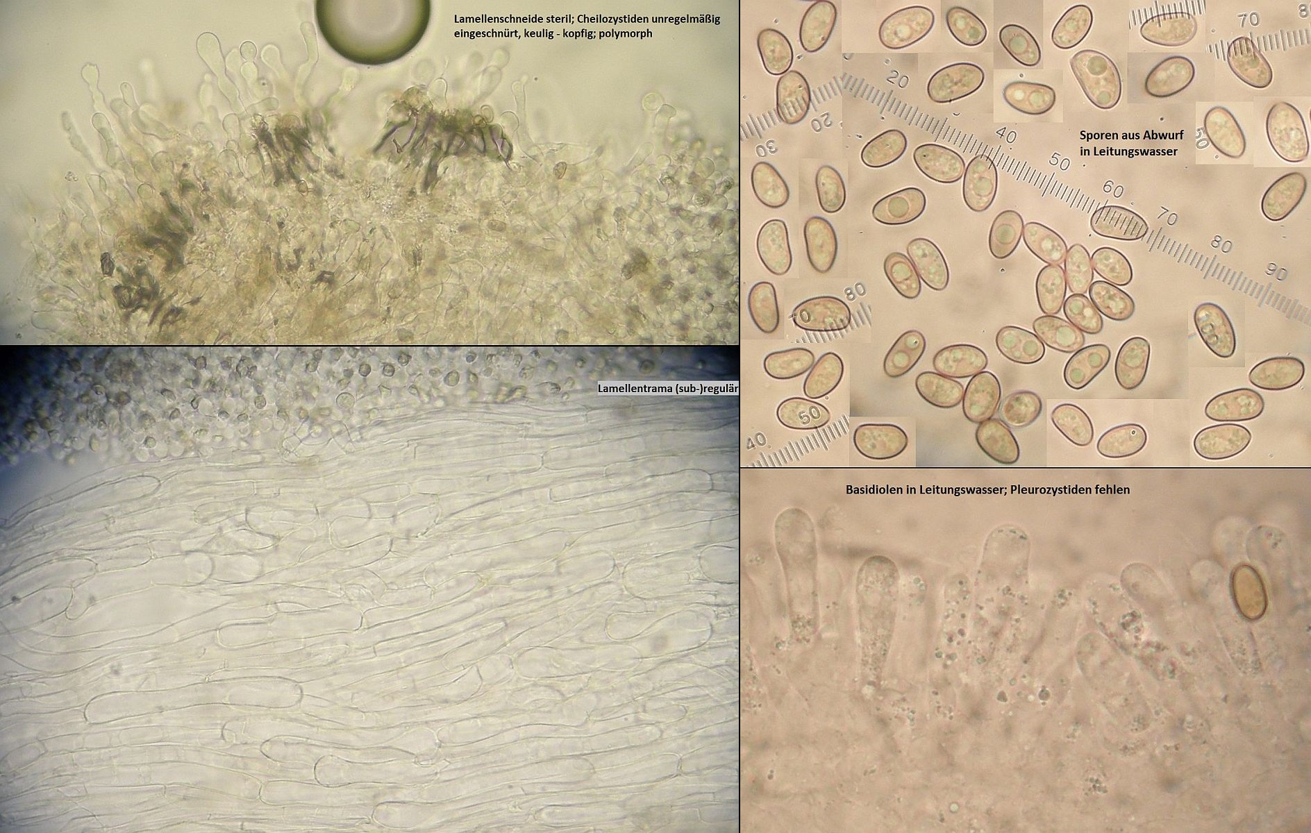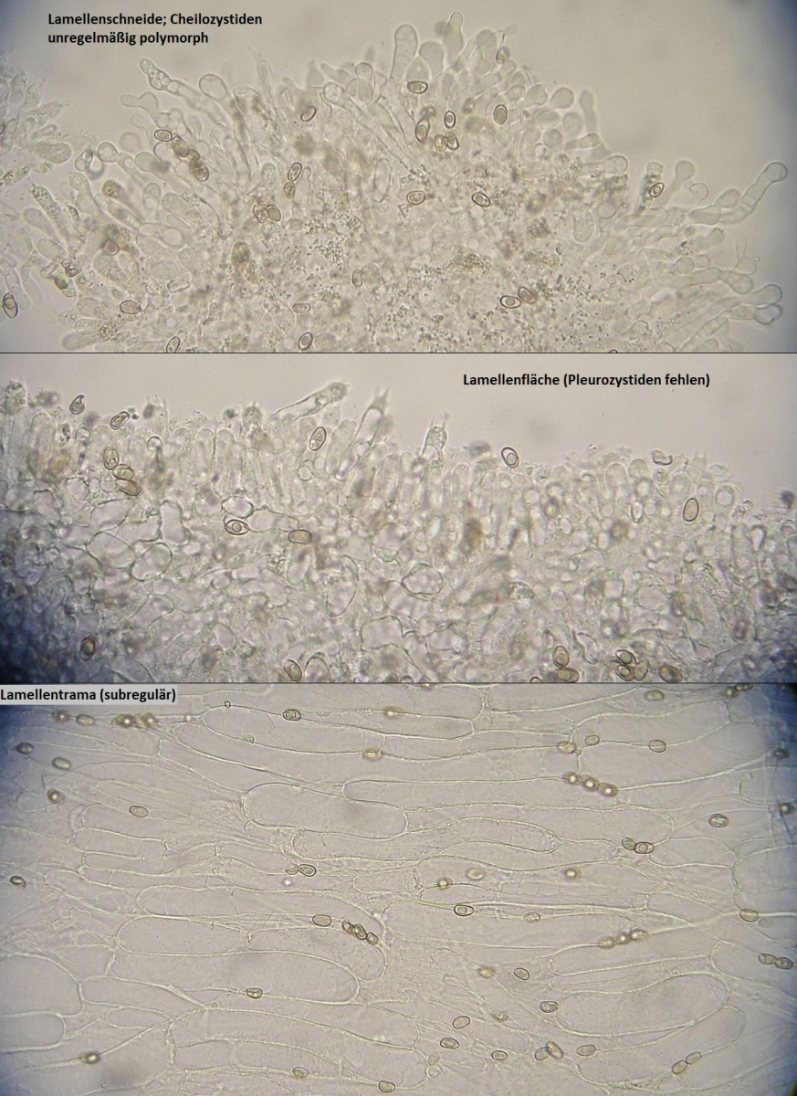 Lamellen: jung fast weiß, mit Reife mehr und mehr ockerbraun bis hell milchkaffebraun umfärbend; breit angewachsen oder kurz ausgebuchtet; Lamellen untermischt; Lamellenschneide deutlich und grob weiß beflockt; steril, Cheilozystiden unregelmäßig keulig, zylindrisch oder angedeutet moliniform; keine Chrysozystiden, Pleurozystiden fehlen.