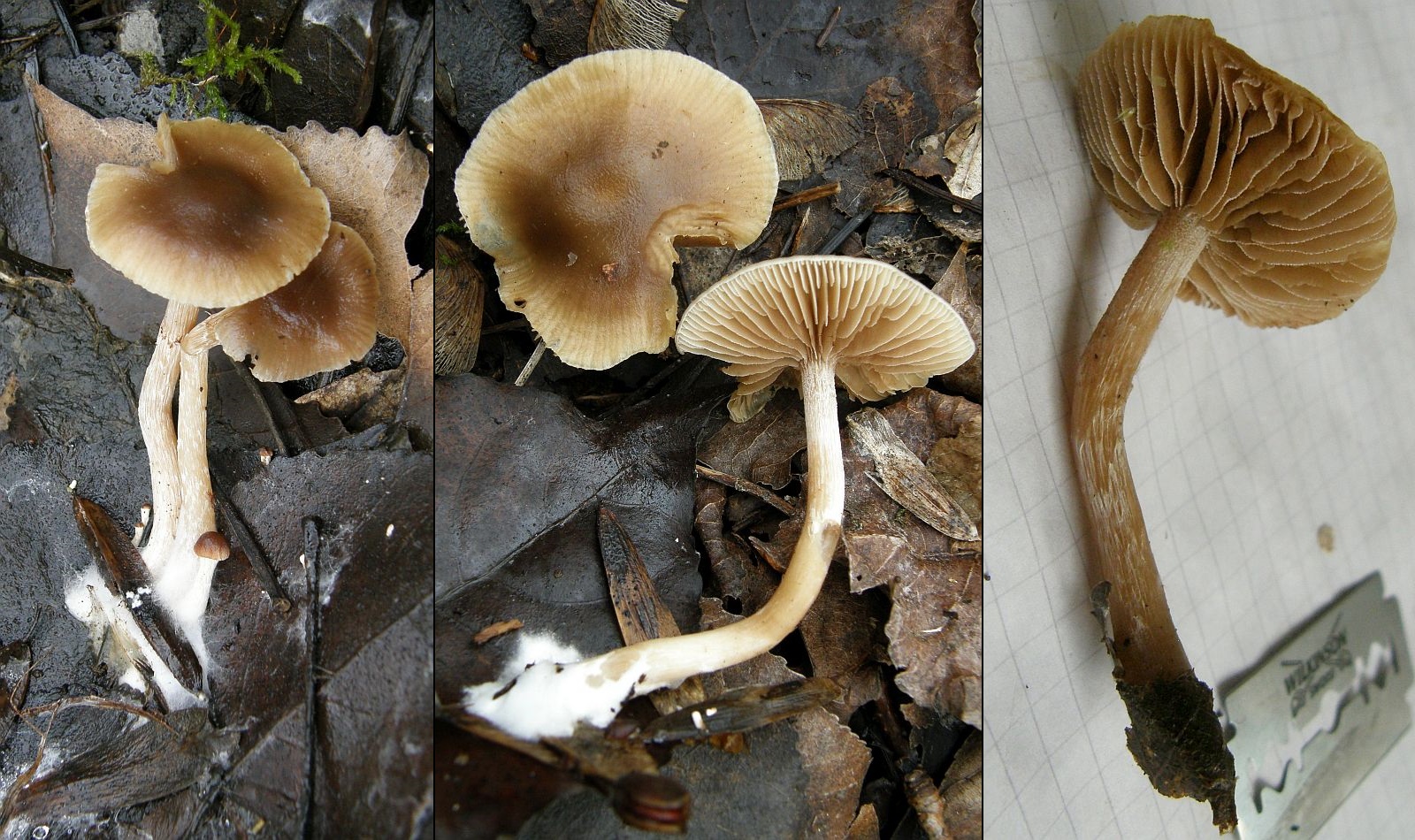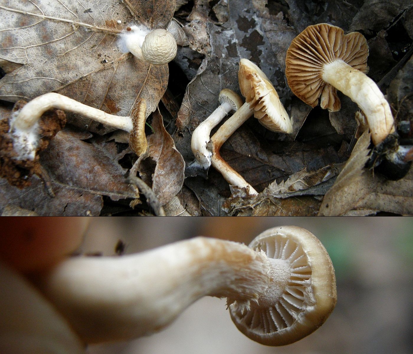 Stiel: Schlank, oft verbogen oder gekrümmt, Stielbasis oft gekniet und stark weißfilzig, am Substrat flach und breit ansitzend und dort besonders dick mit weißem Filz überzogen, der auf das Substrat (meist Blätter) ausläuft; Stieloberfläche weißlich längsfaserig, darunter ockerlich, ockerbraun oder gelbbraun; oft mit vergänglicher, faseriger Ringzone; Stielspitze weißlich bereift (durch Kaulozystiden)