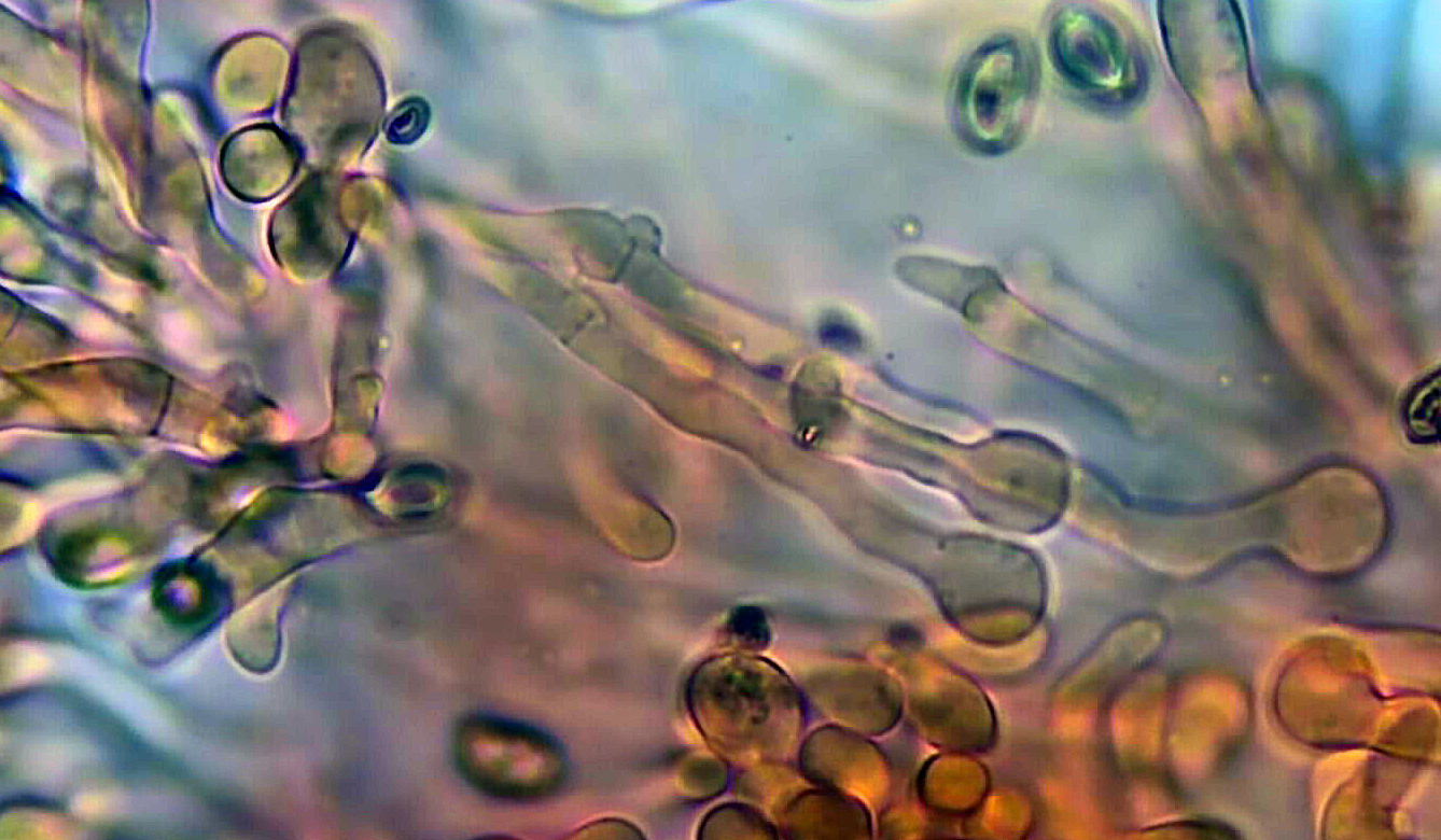 Stielspitze mit weißen Flocken (Kaulozystiden).