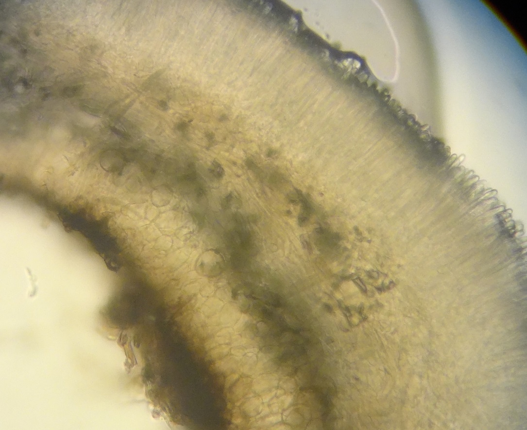 Ich habe versucht, ein Querschnittspräparat anzufertigen, um nach dem braunen Subhymenium zu schauen. Auch nach Andreas' Mollisia-Schlüssel ein eindeutiges Merkmal für Ingos Favoriten Mollisia lividofusca.