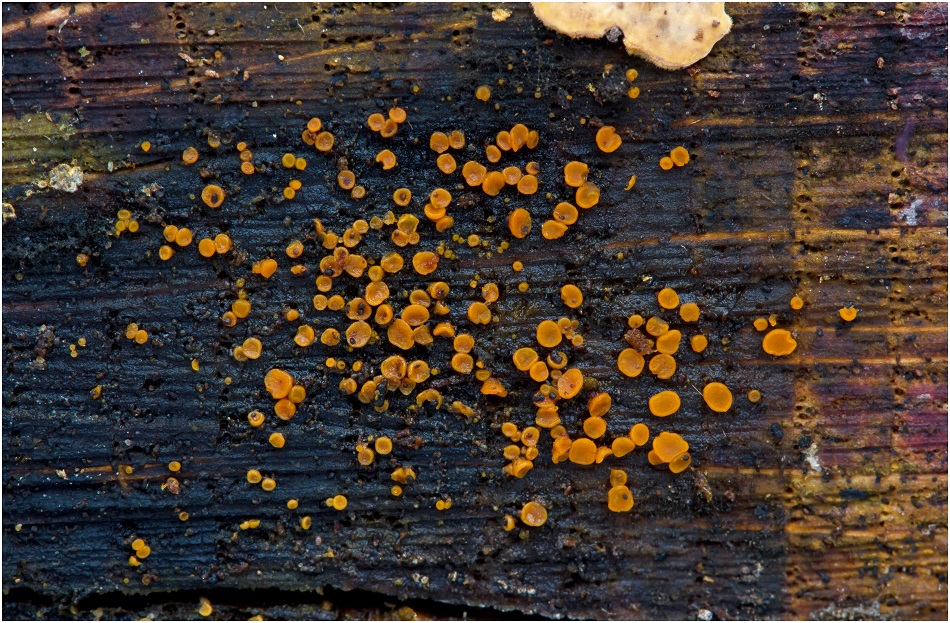 Bei dem geröteten Holz könnte ich mir vorstellen, daß da jemand einen Pinsel mit Farbe in der Hand hatte. Sieht aus wie die Überreste von einer Markierung. Also ich vermute da keinen Hyphodiscus. ;)