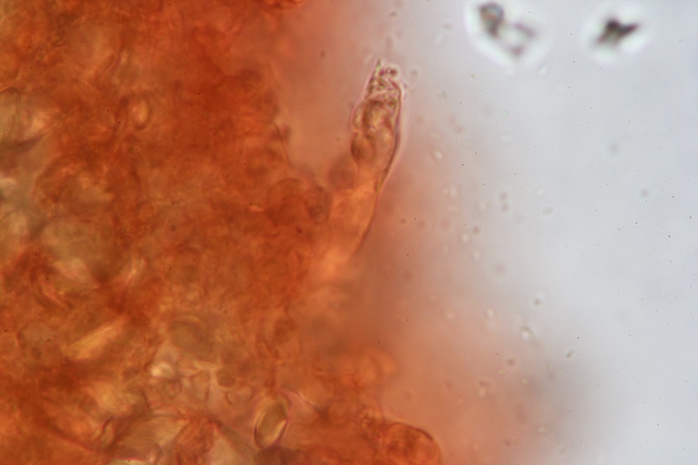 Fruchtkörper zeigt Zystiden (?) und das die Basidien 4-Sporig sind.