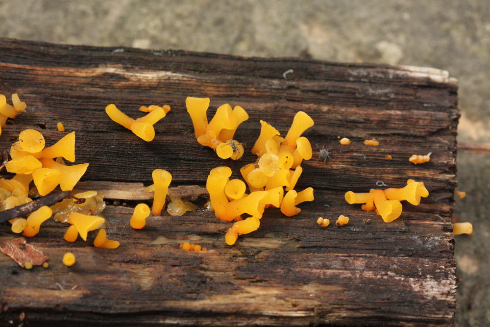 14: Leuchtend gelb auf Eichenholz, und ich habe keine Ahnung. Etwa einen Zentimeter lang. Kein Hörnling, denke ich, und für Bisporella sind die doch zu länglich und fest, oder? Dummerweise keine Probe mitgenommen...