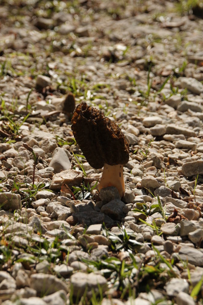Morchella elata, Spitzmorchel, im Schotter am Wegesrand