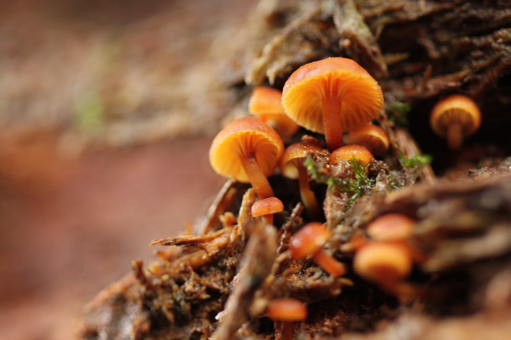 04: Xeromphalina campanella, Geselliger Glöckchennabeling (so denke ich doch), an Tannenstubben