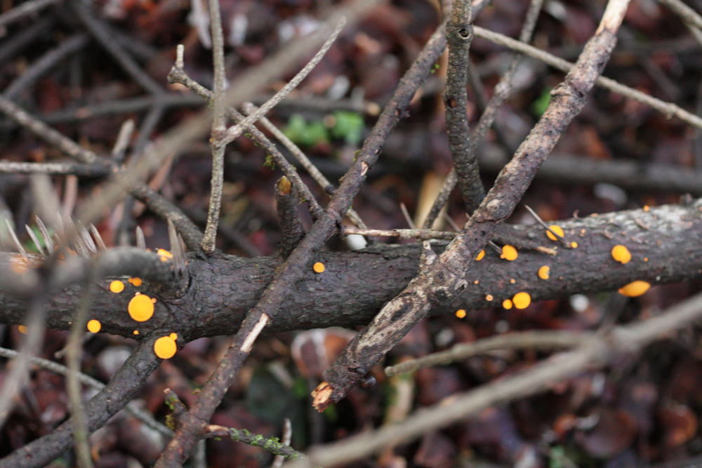 14: Leuchtend gelb auf Eichenholz, und ich habe keine Ahnung. Etwa einen Zentimeter lang. Kein Hörnling, denke ich, und für Bisporella sind die doch zu länglich und fest, oder? Dummerweise keine Probe mitgenommen...