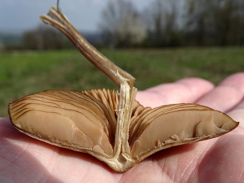 Lamellen: beige-braun, Schneiden dunkler braun und sanft gewellt, fast frei, mit unterschiedlich langen Zwischenlamellen.