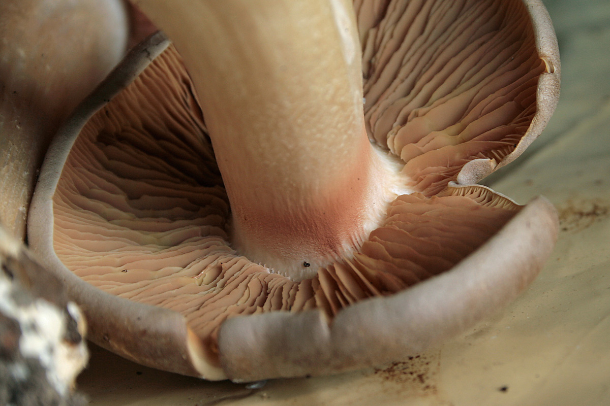 Aber hier wirken die Lamellen des Maipilzes breiter als die des Riesenrötlings.