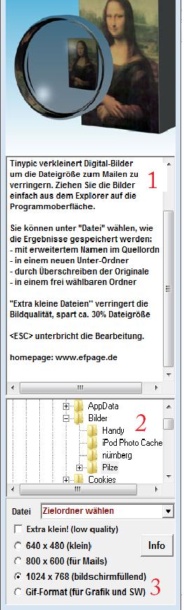 schritt 1: man wählt die größe die man haben möchte und einen ordner wo die bilder verkleinert hinkommen (man kann den ordner der originale nehmen, sie werden dann umbenannt dazugespeichert oder ersetzt oder man nimmt einen ganz anderen ordner) Im Screenshot nr 3