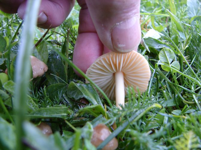es ist immerhin ein häufiger Pilz, den ich in erster Linie auf gemähten Wiesen finde. Das erste, was einem da auffällt, sind die üblichen Hexenrige ,und , daß die sehr häufig gebuckelt sind, wie auch auf Michaels Fotos. Klar muß dann auch der Rest stimmen.
