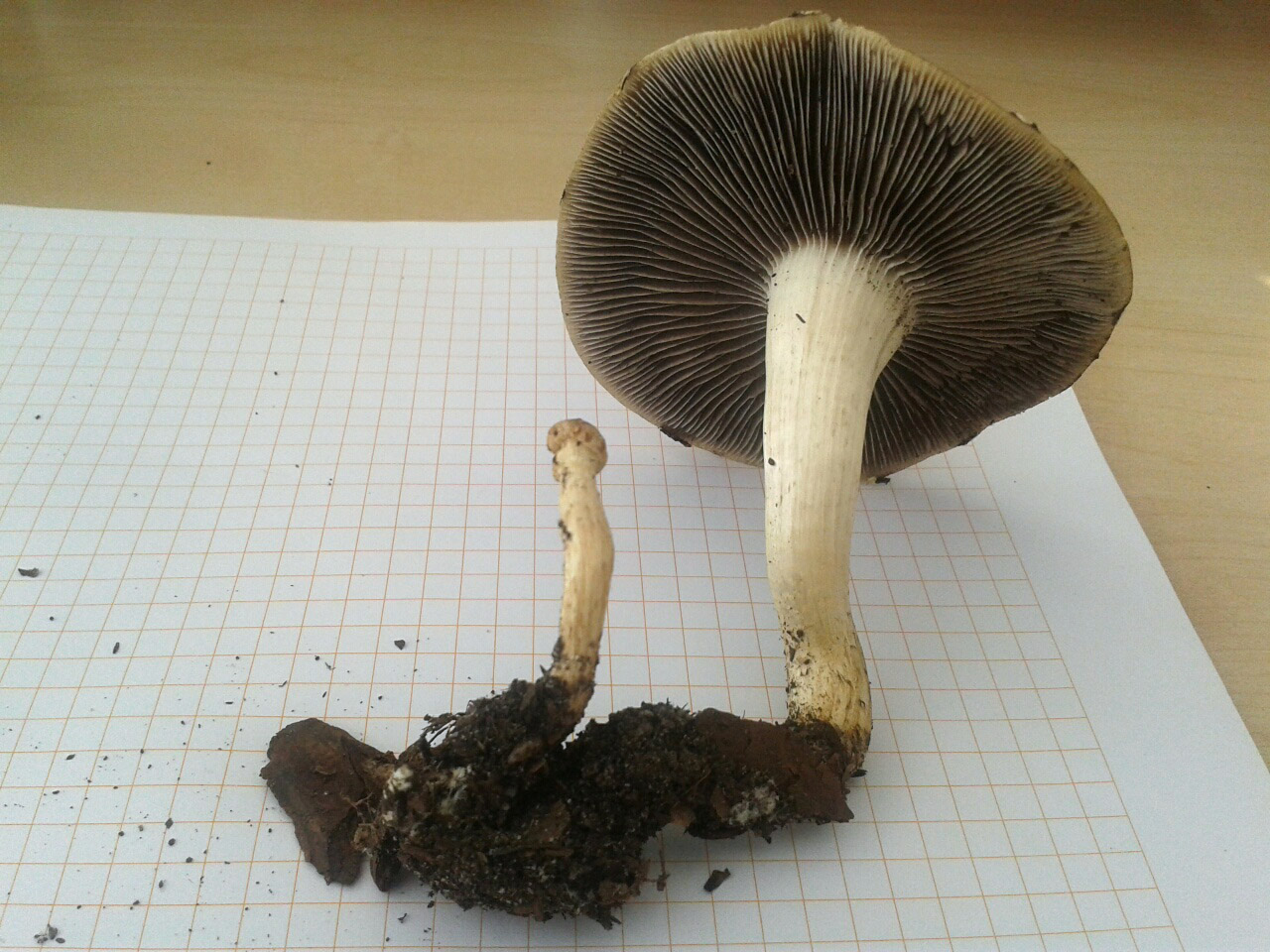 Huthaut hellbraun, feldrig aufgerissen. Hut und Stiel weiß, Lamellen graubräunlich, nicht frei. Ca. 7 cm Durchmesser, Höhe ebenso. Dickfleischig, Hutfleisch weich, Mehlgeruch vorhanden. Stiel innen wattig. Soweit alles im grünen Bereich.