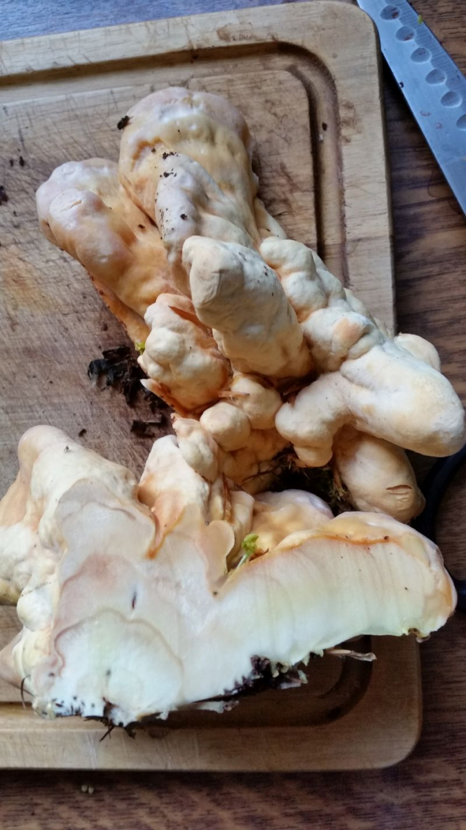 Ansonsten müsste man schon unbedingt die Sporen vermessen. Falls der nicht nach ein paar Stunden an Schnittstellen dunkelbraun bis schwarz wird, würde ich eher zu einem blassen Schwefelporling (Laetiporus sulphureus) tendieren.