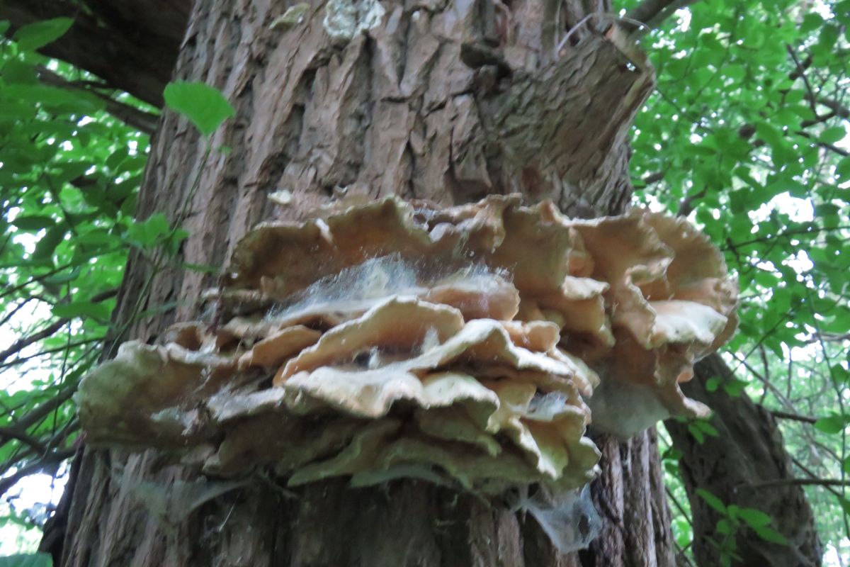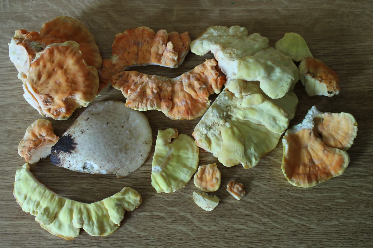Ich vermute stark dass es die ersehnten Schwefelporlinge sind, aber in einem sehr alten Zustand. An den selben Bäumen habe ich solche Pilze bereits im Winter gesehen (Dezember/Januar), auch schon überfällig. Die Pilze sind hart und bruchig. Man kann sie mit der Hand relativ leicht zurkrümmeln.