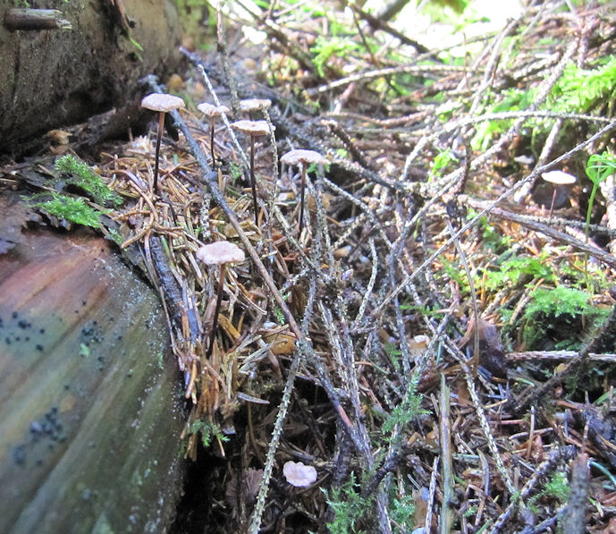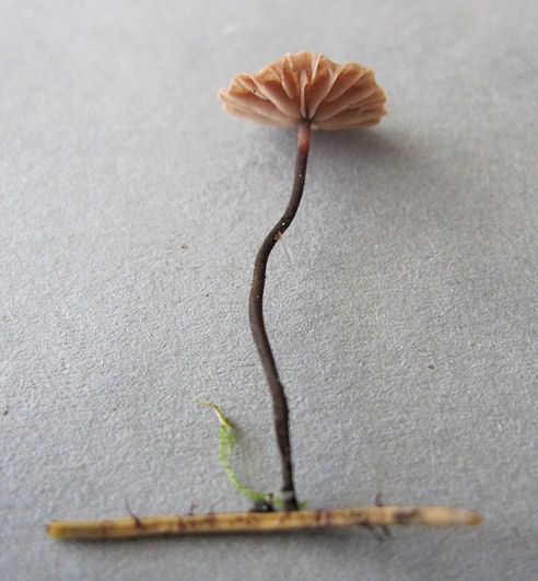 für Rosshaar-Schwindlinge halte ich diese geruchsarmen Pilzchen, die auf Nadelstreu in einem Fichtenforst wuchsen, einige sogar auf einer einzelnen Nadel. Passt für mich ganz gut zu den Bildern und Angaben in den Pilzkompendien, nur ist dort die Hutgröße stets bis maximal 10 mm angegeben. Bei meinem Fund geht der Hutdurchmesser allerdings bis 15 mm. Kann ich bei Marasmius/Gymnopus androsaceus bleiben oder liege ich daneben? (Die Nahaufnahmen im Kunstlicht machen den Pilz brauner als er ist.)