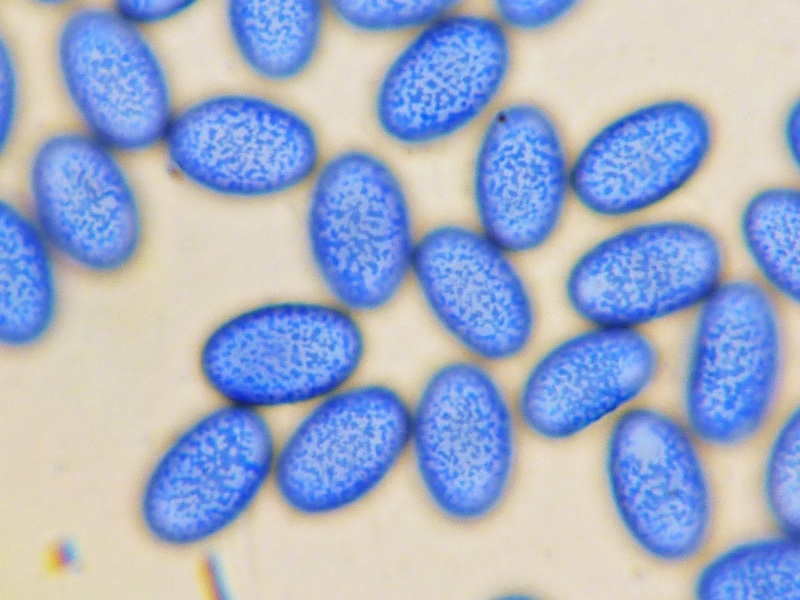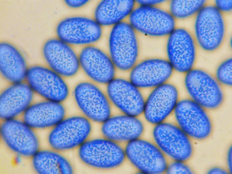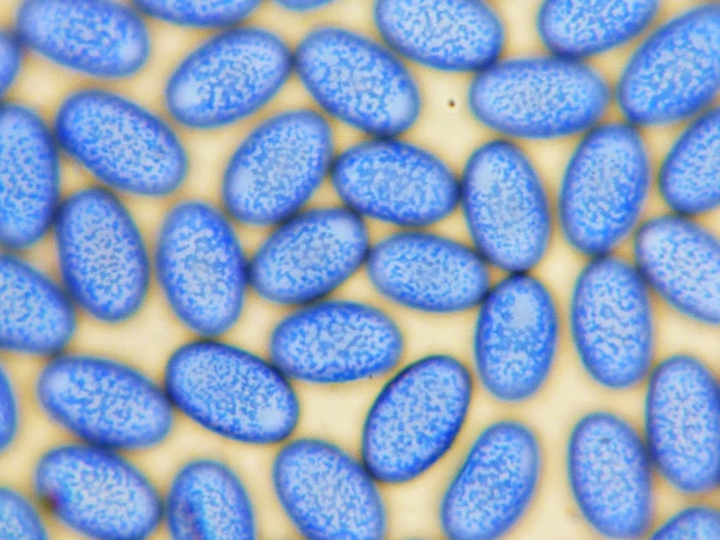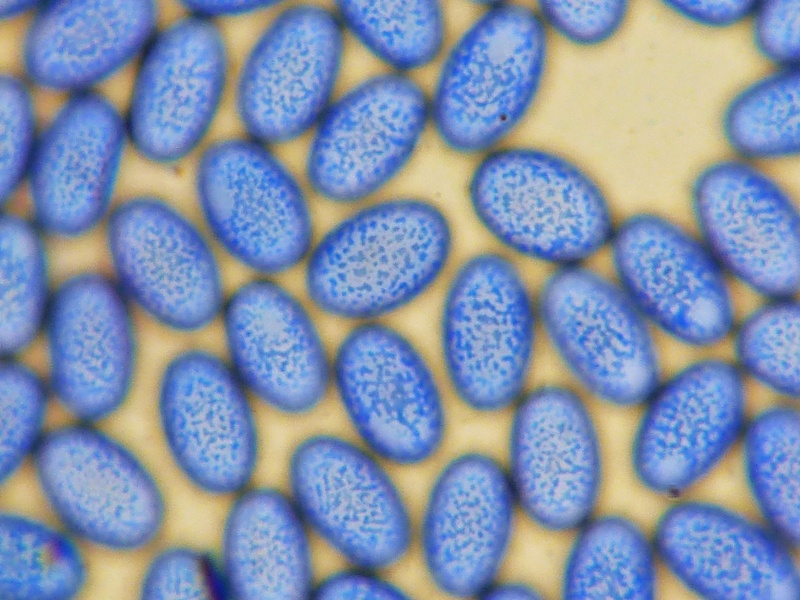 Interessanterweise ist so das Anfärben der Sporen mit Baumwollblau (Sporen vorher vermessen!!) auch viel einfacher. Man muss nur ganz wenig BWB an den Rand des Deckgläschens geben, so dass es unter dieses fließt. Klappt das nicht, das Deckgläschen ganz leicht und sehr wenig mit einer Nadel anheben. Das übliche Erhitzen der Probe kann unterbleiben. Will man fotografieren empfiehlt es sich, die Probe 10-15 Minten nach dem einfärben stehen zu lassen. Das Ganze setzt sich dann durch Verdunstung und die Sporen liegen fast alle in einer Ebene.