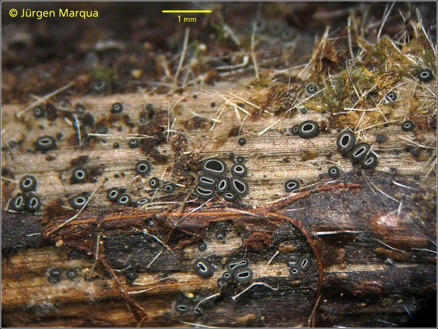 Apothezien jung kugelib, älter urnenförmig, dann becherförmig, grauschwarz - anthrazid mit hellerem Becherrand. Zahlreich bis gesellig an feuchten Stängeln von Rumex (zusammen mit einem glasartigen witzig kleinen Becherling (Olla spec. oder sowas).