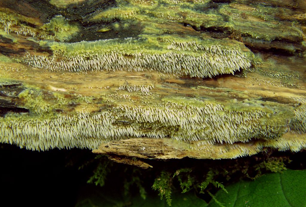 Gefunden an der Unterseite eines sehr feucht liegenden, finalmorschen (Buchen?)-Astes. Im Tageslicht hat der Pilz eine grünlich-ockergelbliche Farbe. Auffallend sind die vielen stacheligen Auswüchse. Diese bestehen aus einem Hyphengeflecht, wobei die herausstehenden Hyphen bräunlich gefärbt sind. Sehr interessant sind, im Hyphengeflecht eingewachsene, kubooktaedrischen Kristalle bis 10 µm Kantenlänge. Skalenoedrische Kristallbüschel wie bei R. bicolor habe ich nicht finden können.