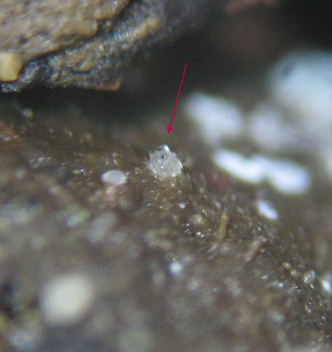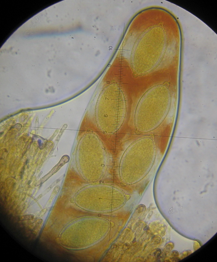 Apothecien sehr klein ( wie kanns auch anders sein ?), weißlich mit rauher Außenseite, mehr hoch als breit, mit heraustretenden Asci:280-340 x 40 µ,zylindrisch Mitte teils leicht verdickt/ aufgeblasen, Sporen biseriat angeordnet, Basis lang gestielt (?-nicht genau gesehen).