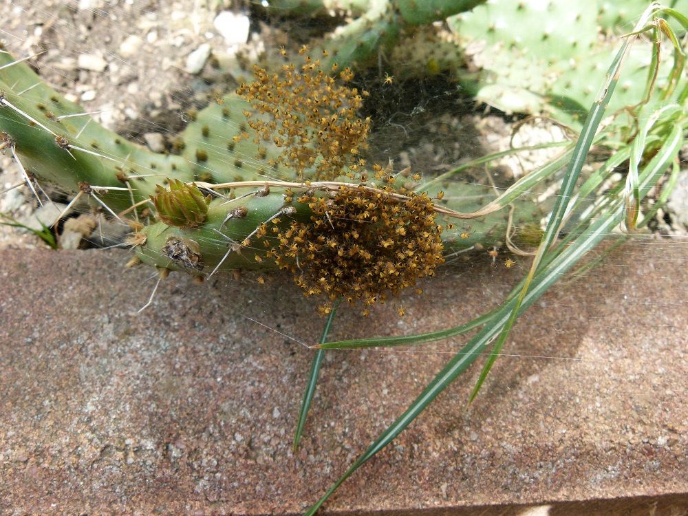 gestern im Garten hinterm Haus konnte ich mit der freischwebenden und kurz vor dem Aufblühen befindlichen Dolde nichts anfangen. Die andere hatte an dem Kaktusblatt Halt gefunden. Ungläubig hockte ich mich hin um mir diese Erscheinung näher zu betrachten.