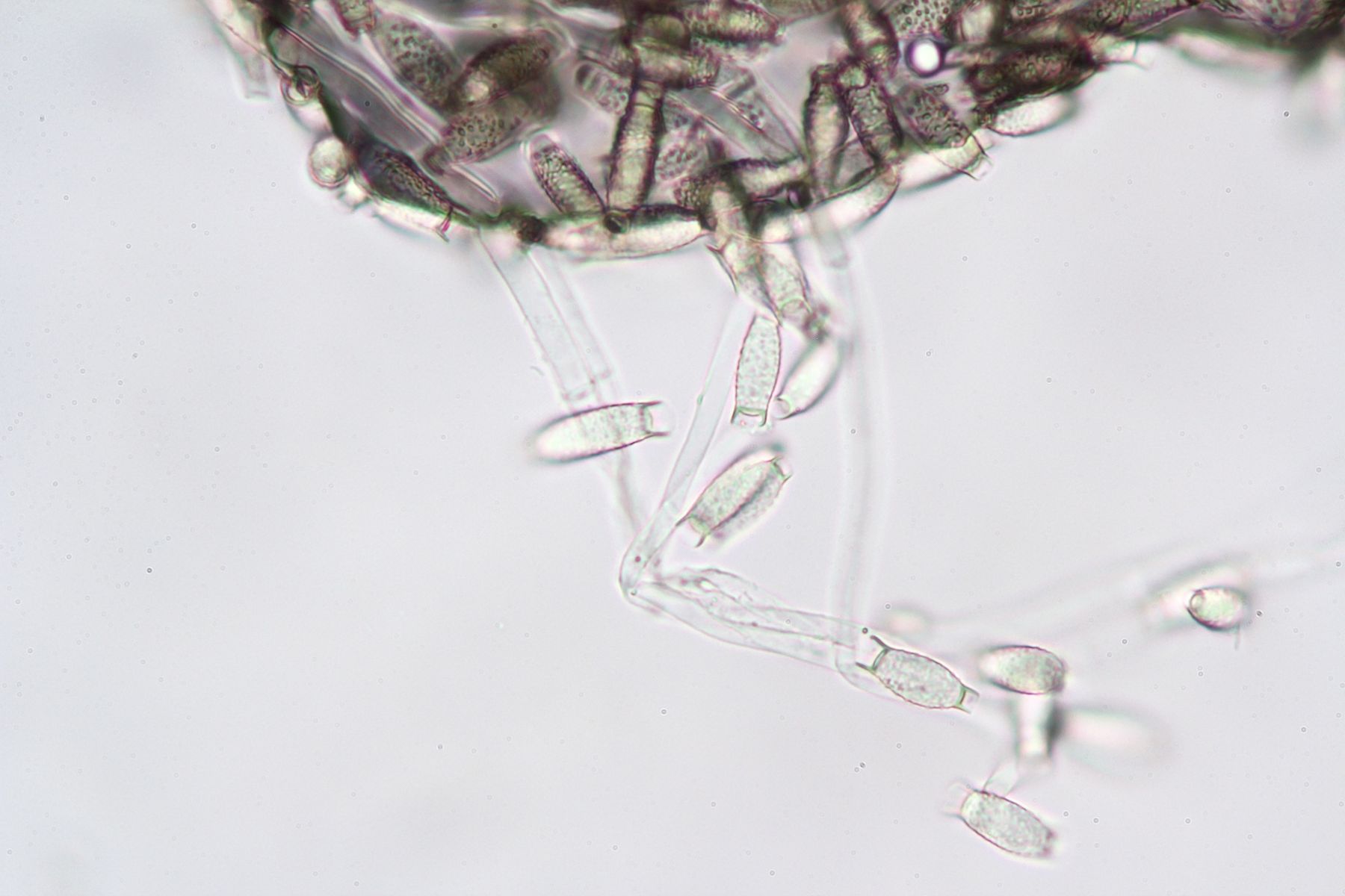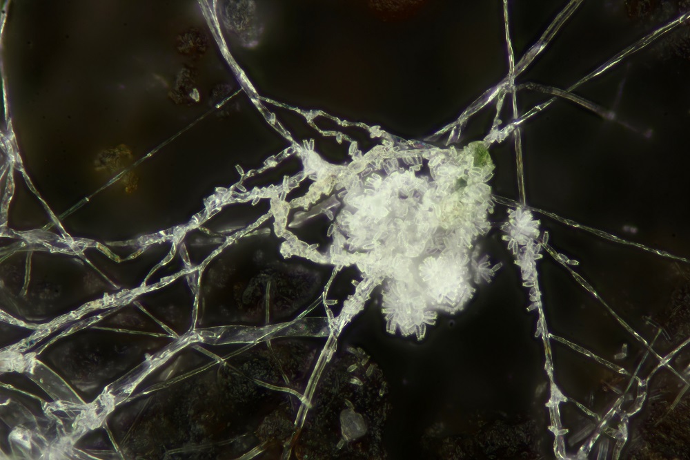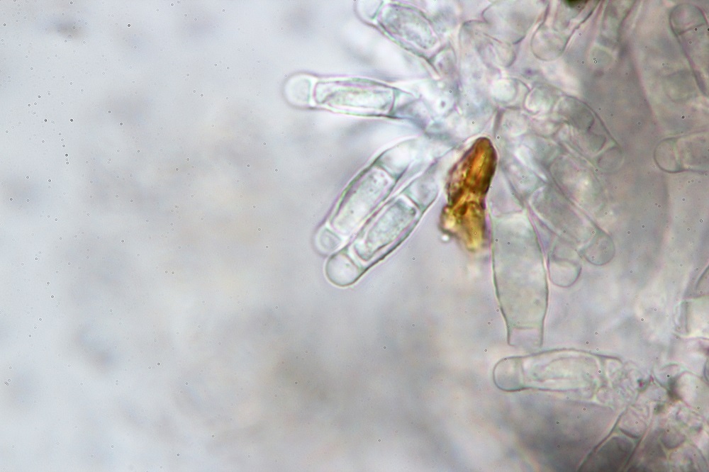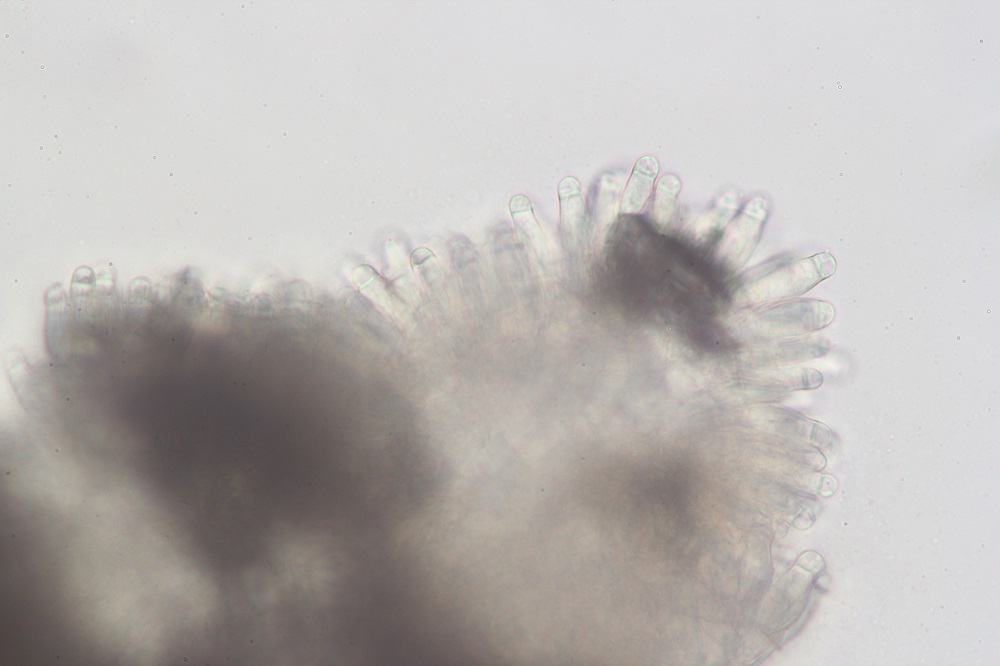 Vor 3 Tagen fand ich ein Schleimpilzartiges Gebilde an einer Wurzel von einem Eichen/Buchenbaumstumpf, dass sich unter dem Mikroskop wohl als Amblyosporium sp. entpuppt hat.