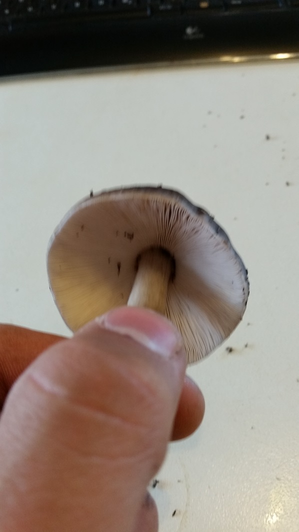 Die Lamellen sind komplett weiß und sehr eng stehend. und der Hut dunkelbraun, zum Rand hin etwas heller.
