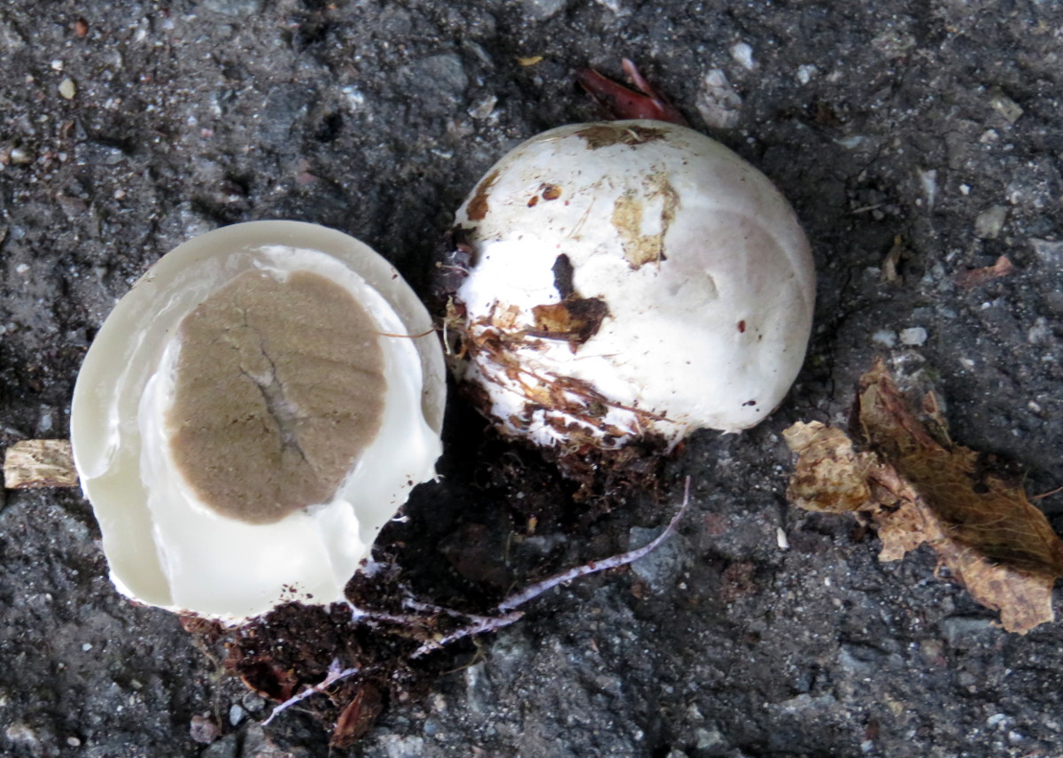 Und zuletzt - ein Blick in eins der mehreren gleich aussehenden Hexeneier, ca. 4 cm Ø. Vielleicht kann jemand erkennen was für ein Pilz daraus wachsen sollte?