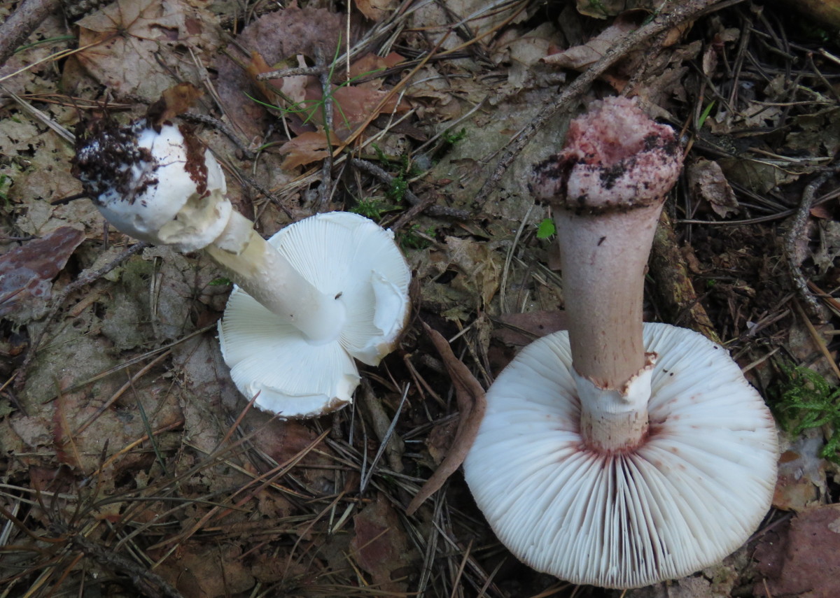 Ganz in der Nähe der Perlpilze gab es auch einige giftige Verwandten. Diese zu finden war eine schöne Erfahrung für mich, die mir noch mal bestätigt dass JEDER Pilz mit dem Perlpilz-Habitus genau auf seine einfachen Merkmale geprüft werden soll: Manschette gerieft + Rosatöne + Rüben-Knolle.