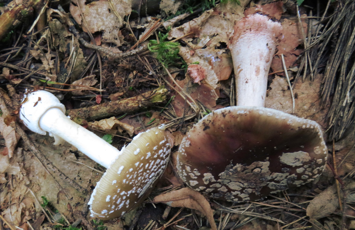 Hier Pantherpilz (l) und Perlpilz (r) zusammen, man sieht den Unterschied ganz gut: