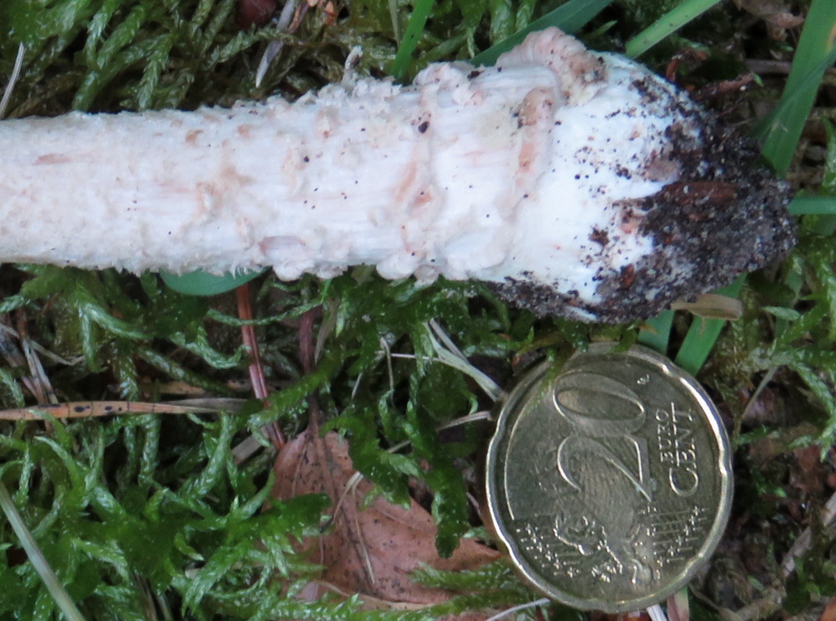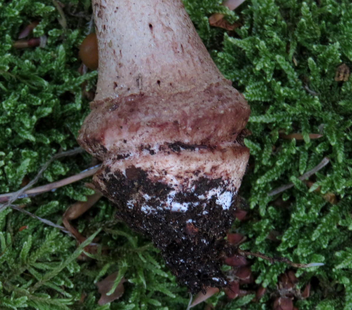 Aber der Stiel ist relativ dünn, unten rau und etwas spiralartig um den Stiel aufgerissen! Ich hoffe dass man es auf dem Bild sehen kann. Ist das ein Perlpilz? Oder ein grauer Wulstling - er soll ja dem Perlpilz ähnlich sein aber seine Stielbasis soll durch 2-3 Ringgürtel von Stiel etwas abgesetzt sein. Gerochen hat er undeutlich, aber nicht angenehm, eher leicht muffig/rettichartig. Warum dann die Rosatöne am Stiel?
