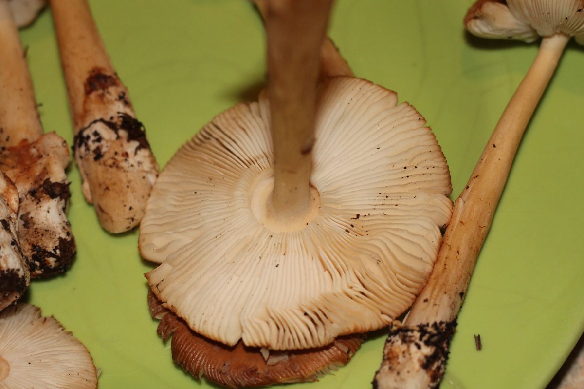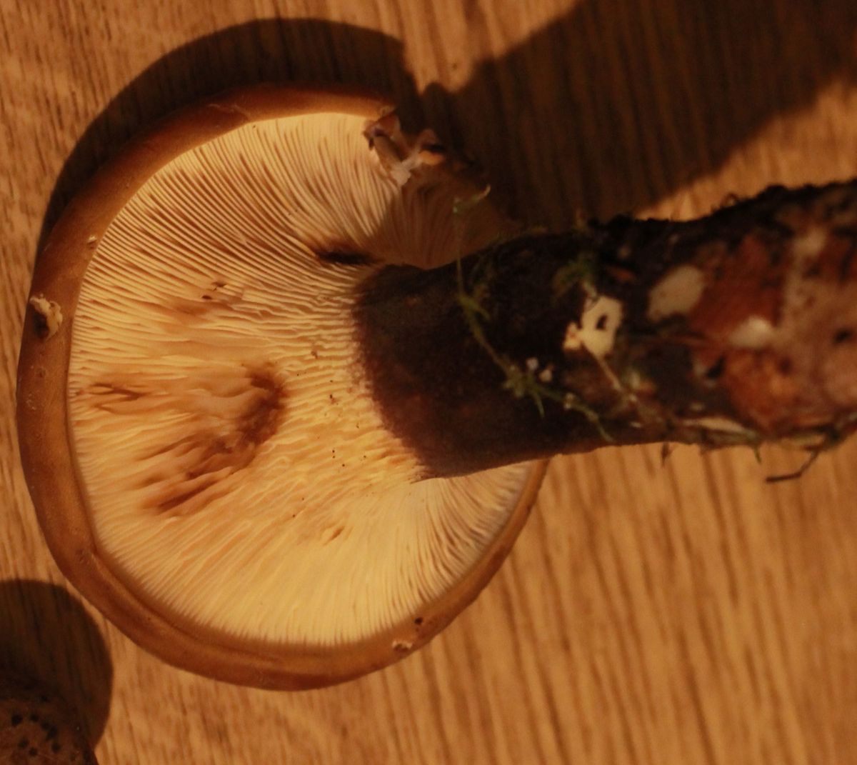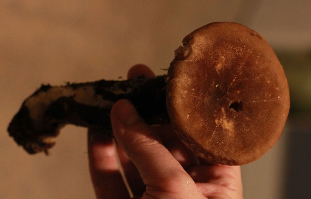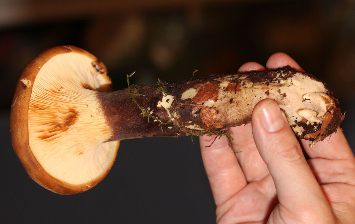 Und noch ein faszinierender Pilz. Solche Pilze wuchsen an einem alten Baumstamm. Man sieht da zuerst nur die Hüte, keine Stiele. Wenn man aber an einem Hut zieht, kommt ein dicker langer Stiel raus, der von unter dem Baumstumpf wächst. Der Pilz ist recht schwer. Die Lamellen sind hell und herablaufend. Stiel und Hut - dunkel, bräunlich, sehr filzig/samtig. Der Stiel ist von fast ganz unten bis zu den Lamellen gefärbt. Der Geruch ist stark pilzig - ich kann ihn leider nicht genauer beschreiben. Ich werde den Pilz keinesfalls essen, aber würde gerne wissen wie er heisst.