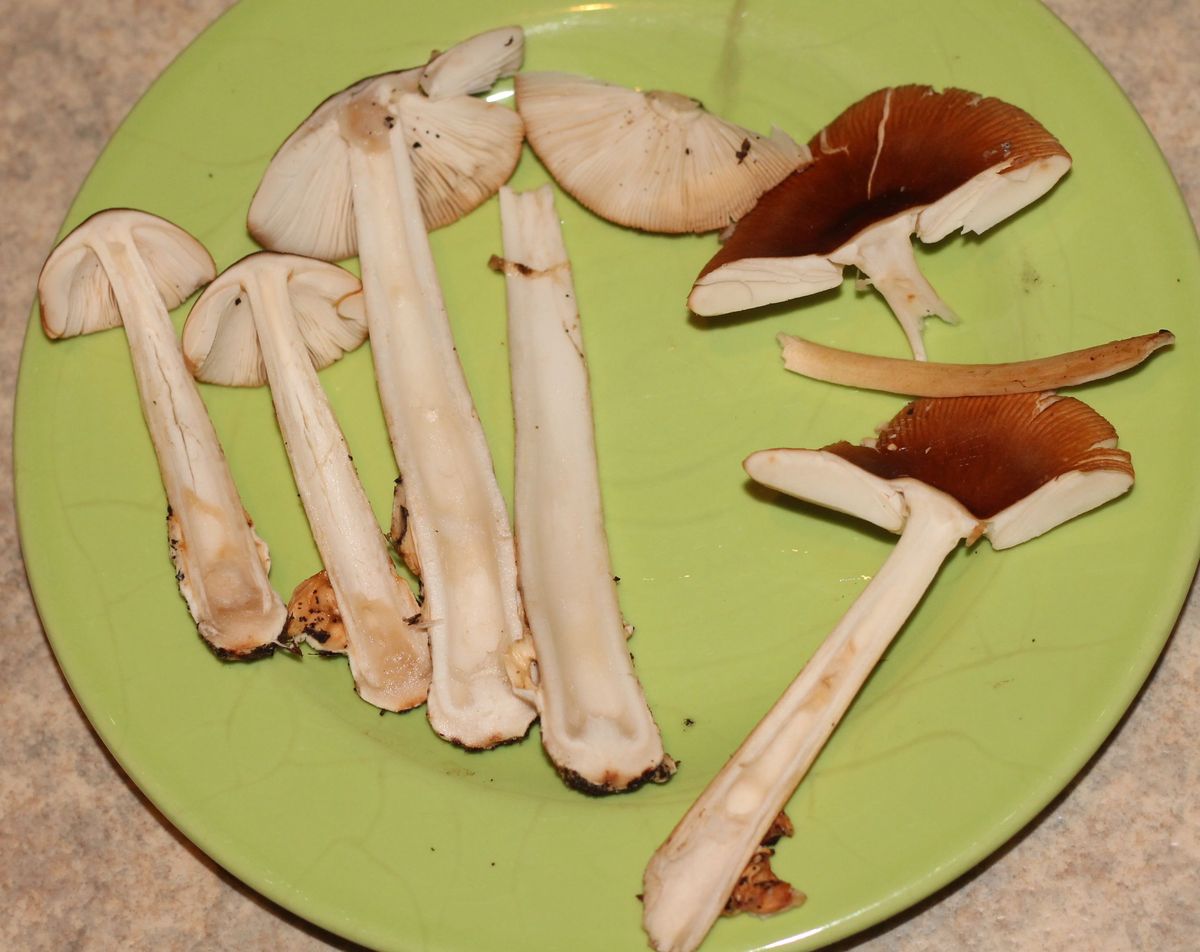 Der Stiel wächst aus einer Volva, hat aber keine Knolle und keinen Ring. Der Stiel ist hohl. Der Hutrand ist ca. zu 1/3 gerifft. Der Geruch ist mild. Die Pilze wuchsen in Gruppen von ca. 5 bis 20 Stück.