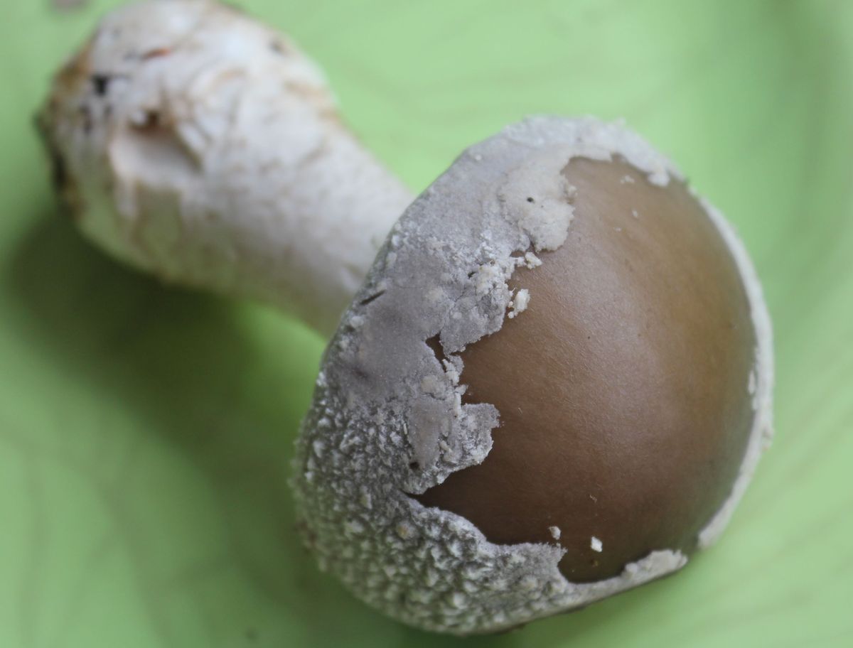 Hat eine geriefte Manschette und eine rübenartige Knolle, wie der Perlpilz. Rötet aber nirgendwo und riecht etwas unangenehm nach einem feuchten Keller.