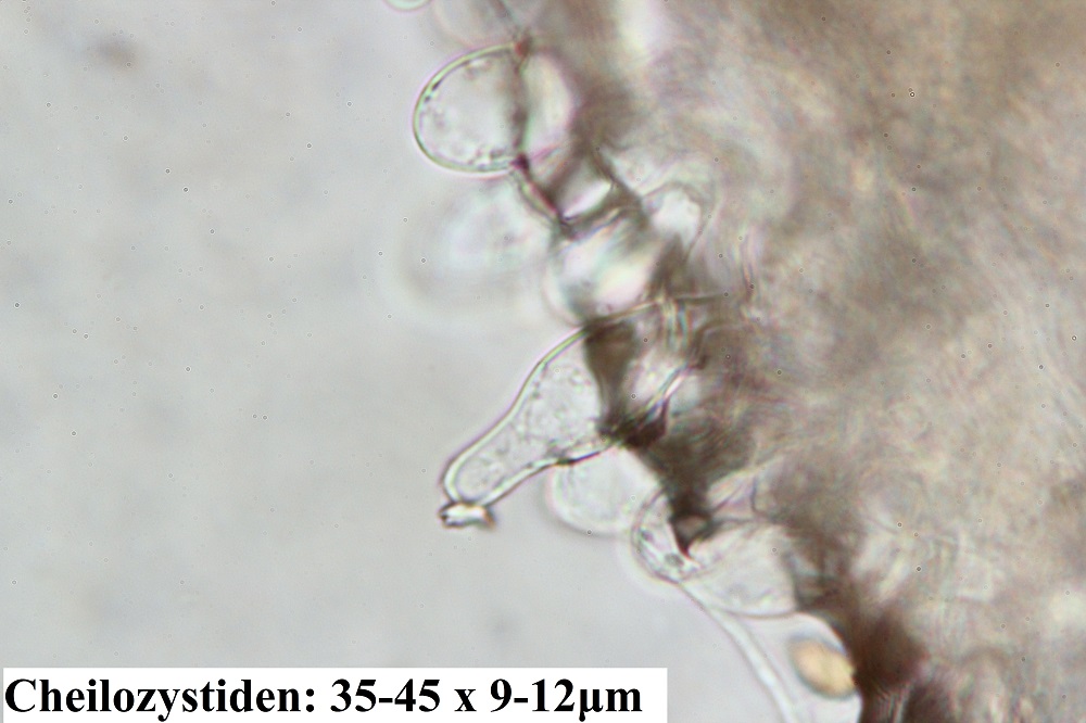 Kaulozystiden sind am Lamellenansatz und Stielmitte vorhanden, ich meine auch welche an der Stielbasis gesehen zu haben, aber sicher bin ich mir da nicht.