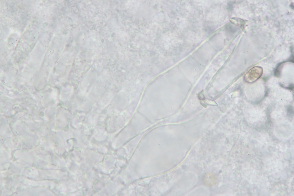 Kaulozystiden sind am Lamellenansatz und Stielmitte vorhanden, ich meine auch welche an der Stielbasis gesehen zu haben, aber sicher bin ich mir da nicht.