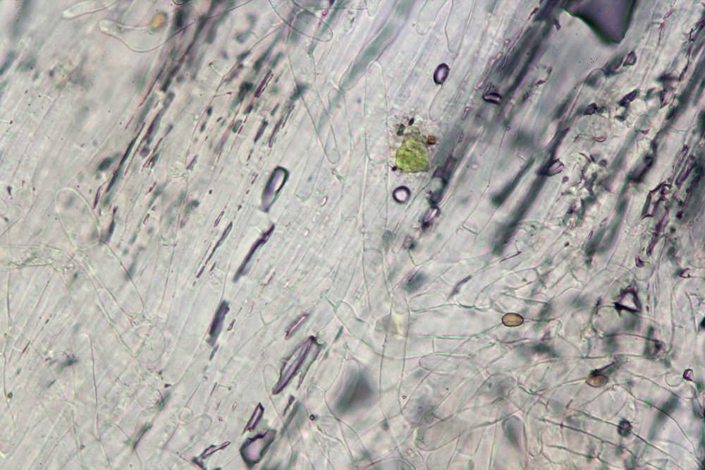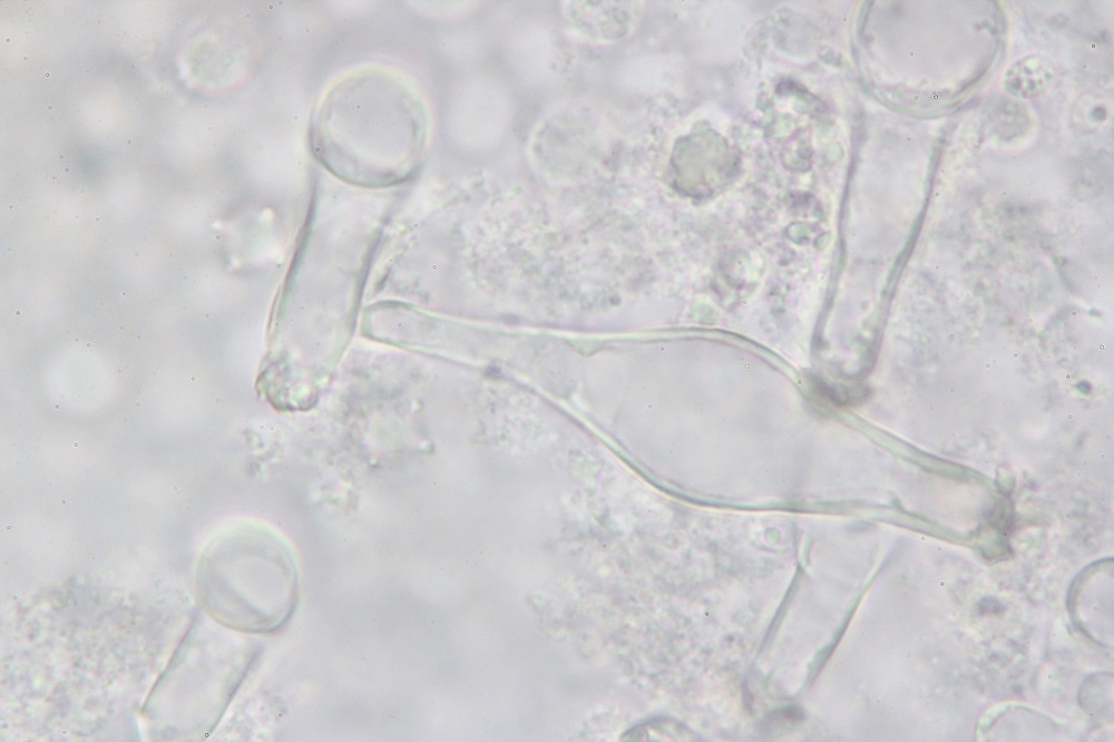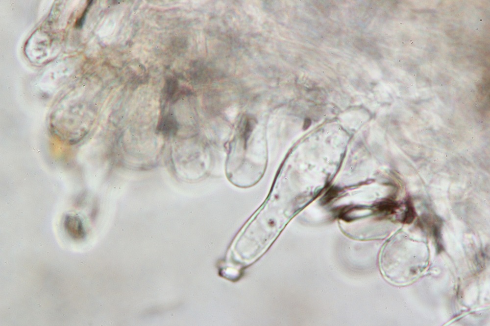 • Ja, das meinte ich, bloß seh ich irgendwievon den Zystiden. Also, ich meine zwar zu erkennen, dass es eine Färbung gibt, aber so erlaubt das leider keine nähere Aussage.