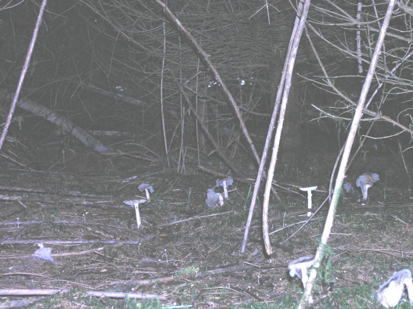 Licht und Moos spielen dabei keine Rolle. Die Schonung ist noch so dicht, dass es darin fast dämmrig ist. Sie wachsen sowohl zwischen den Fichtenreihen, als auch direkt unter den jungen Fichten, wo es sehr trocken und am dunkelsten ist. Die Suche dort ist extrem, weil alles noch durch verdorrte Brombeerranken verhauen ist.